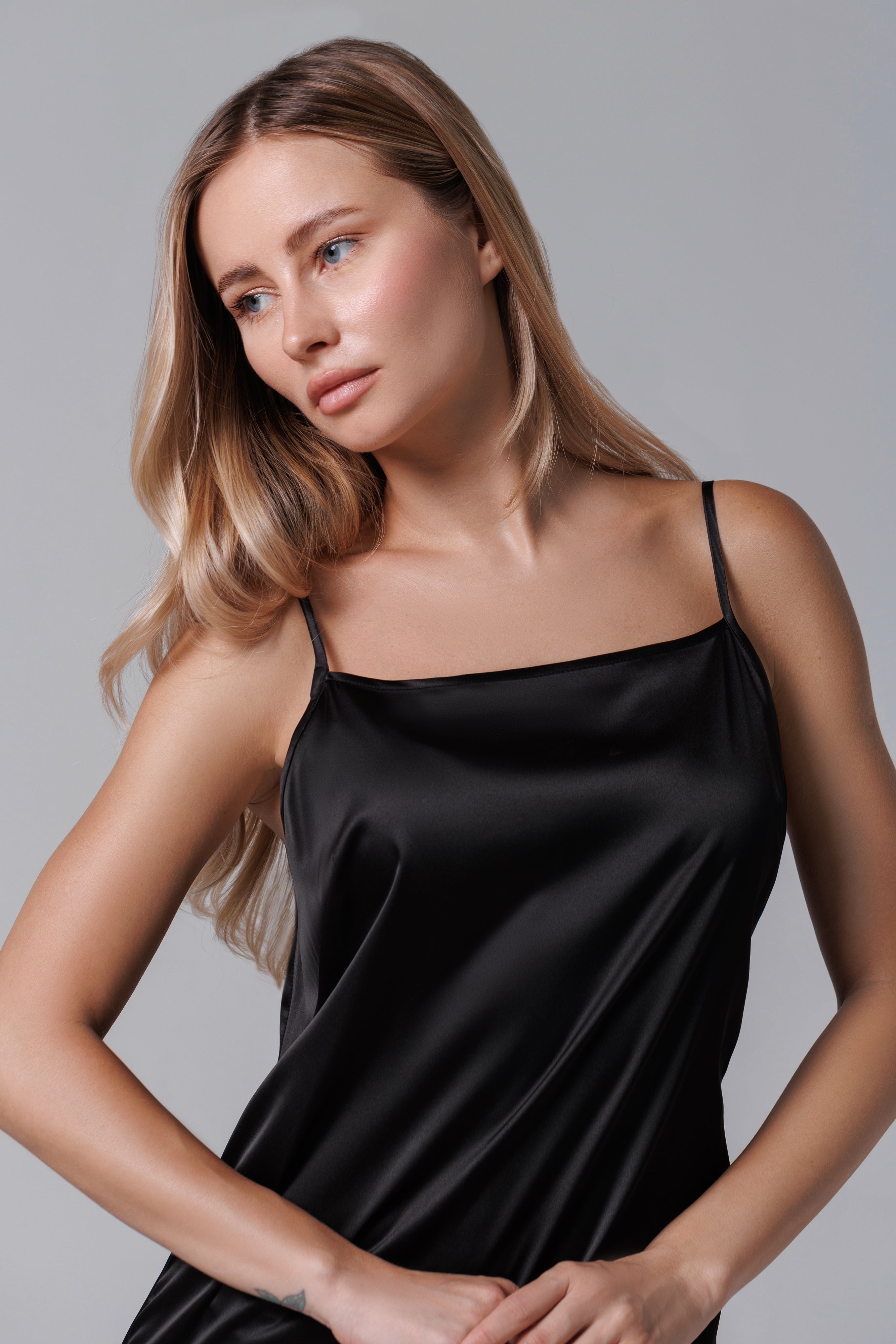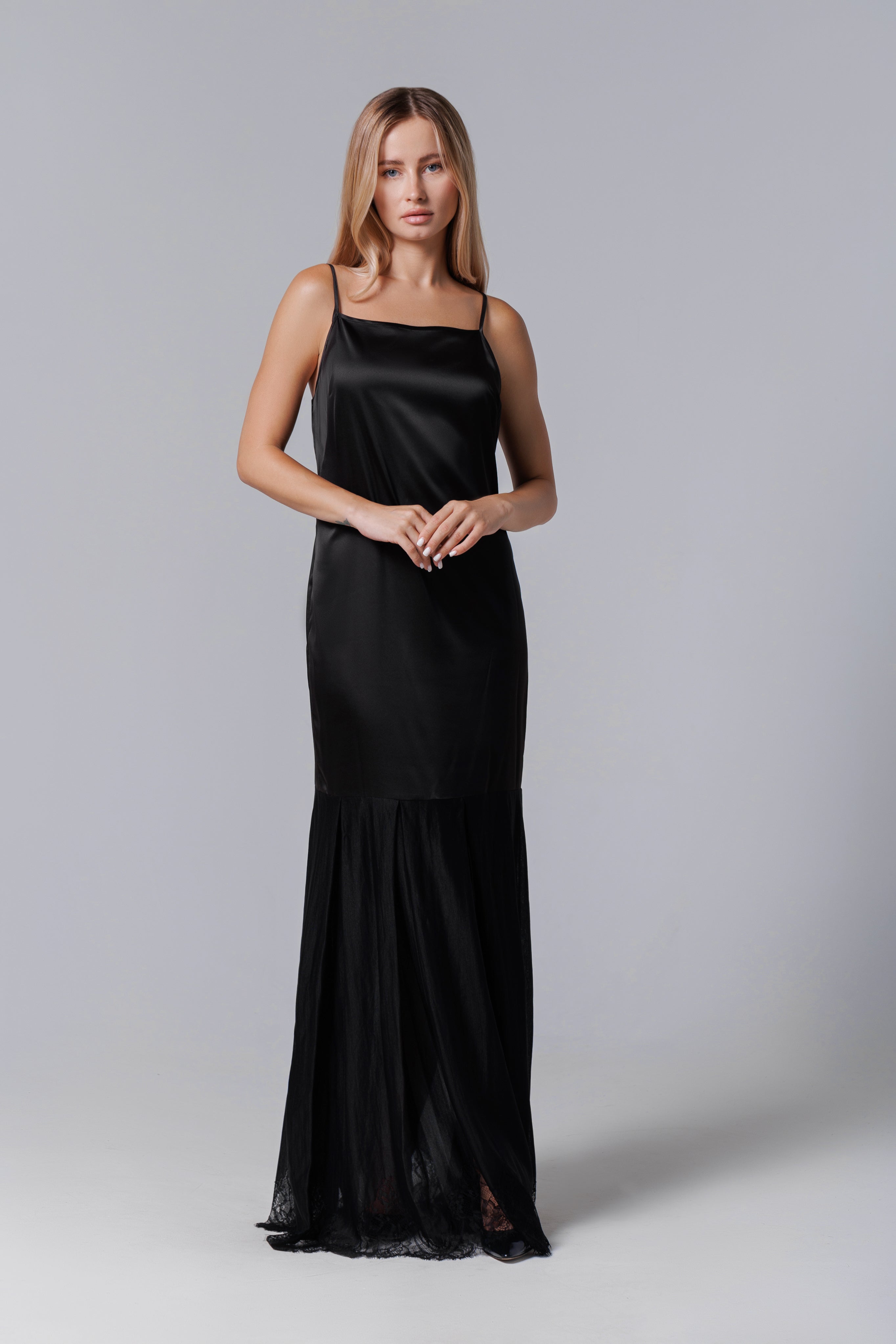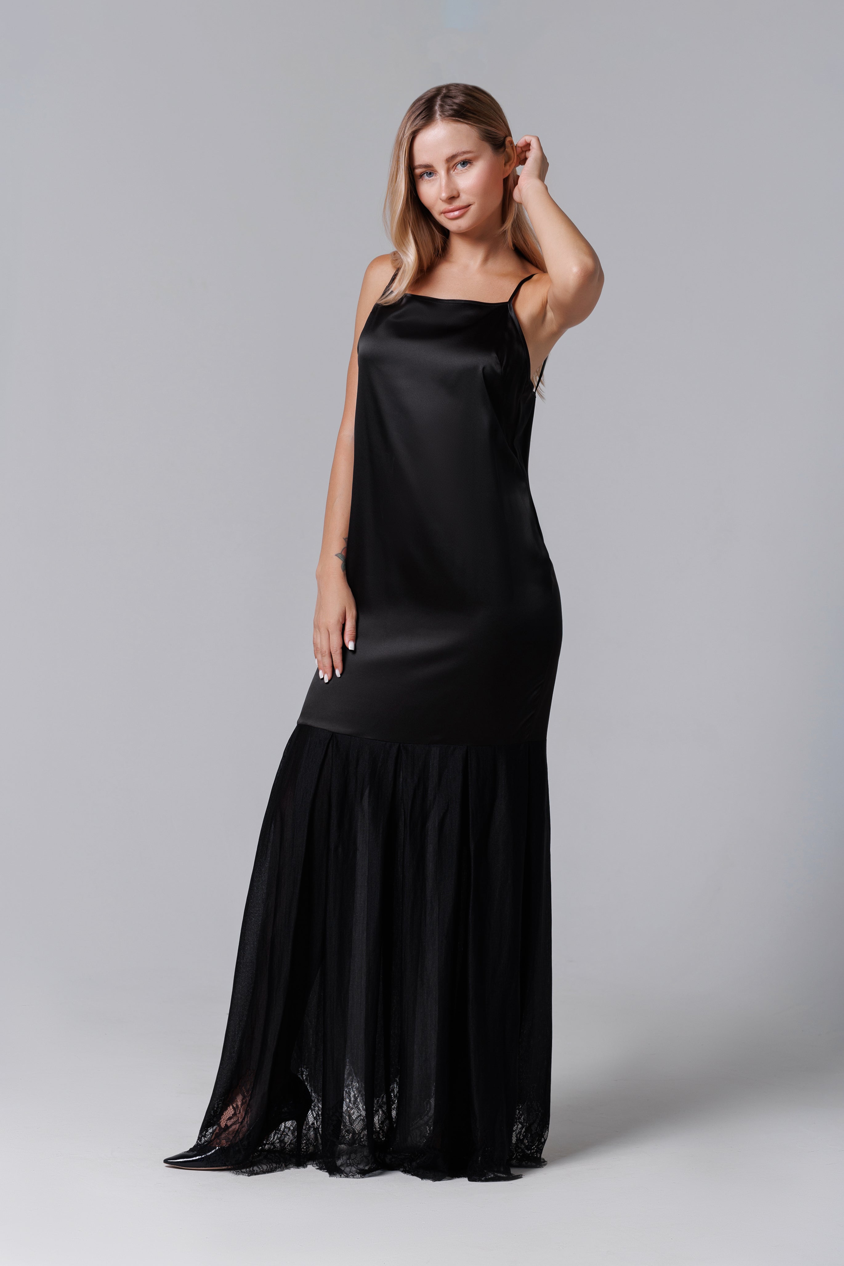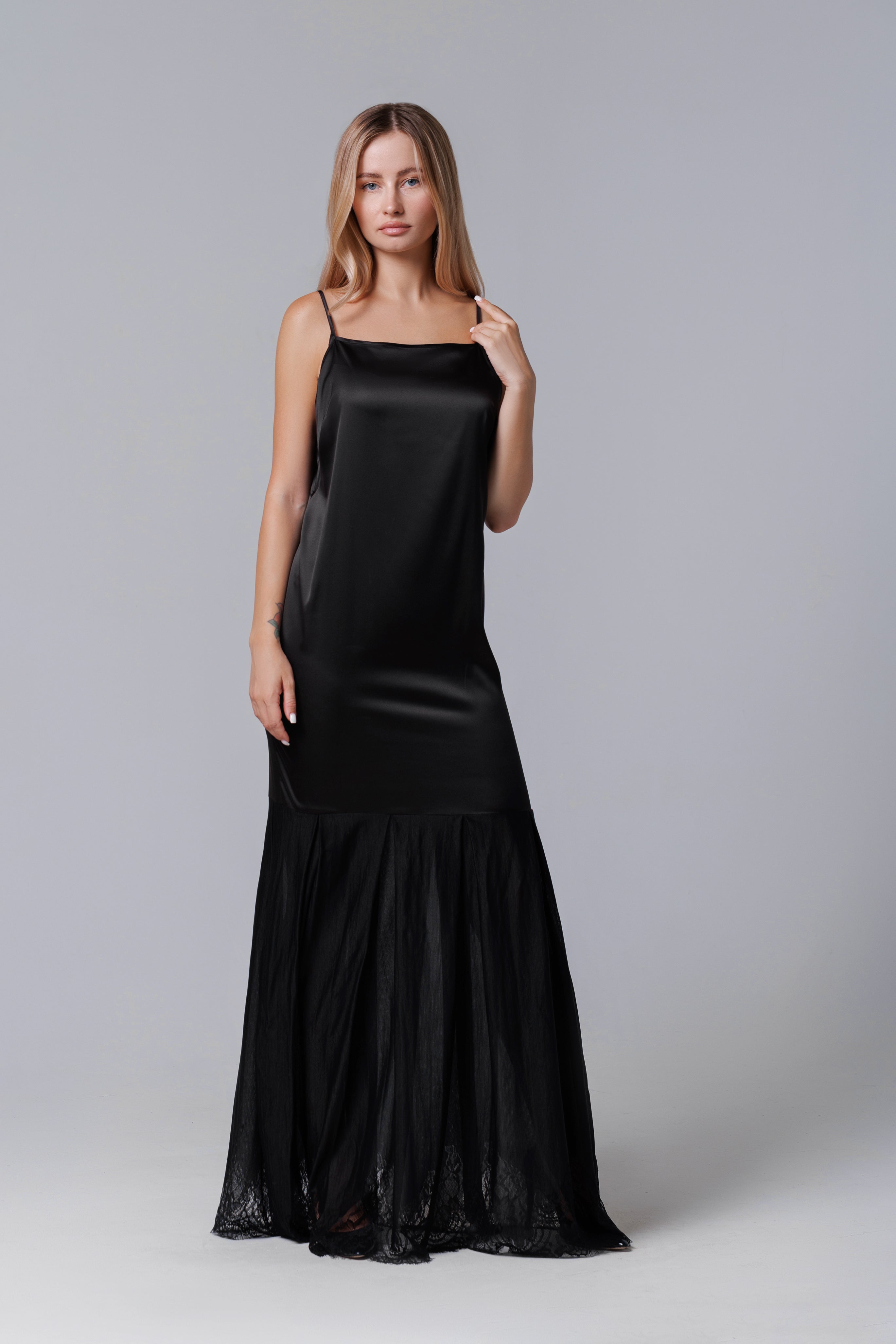 O creație elegantă, cu linii fluide și detalii rafinate – această rochie lungă combină finețea satinului cu delicatețea dantelei franțuzești. Bretelele subțiri și croiala minimalistă conferă un aer modern și senzual, în timp ce partea inferioară din dantelă adaugă o notă romantică și sofisticată. Ideală pentru seri de gală, petreceri elegante sau ocazii speciale, rochia promite să atragă toate privirile.