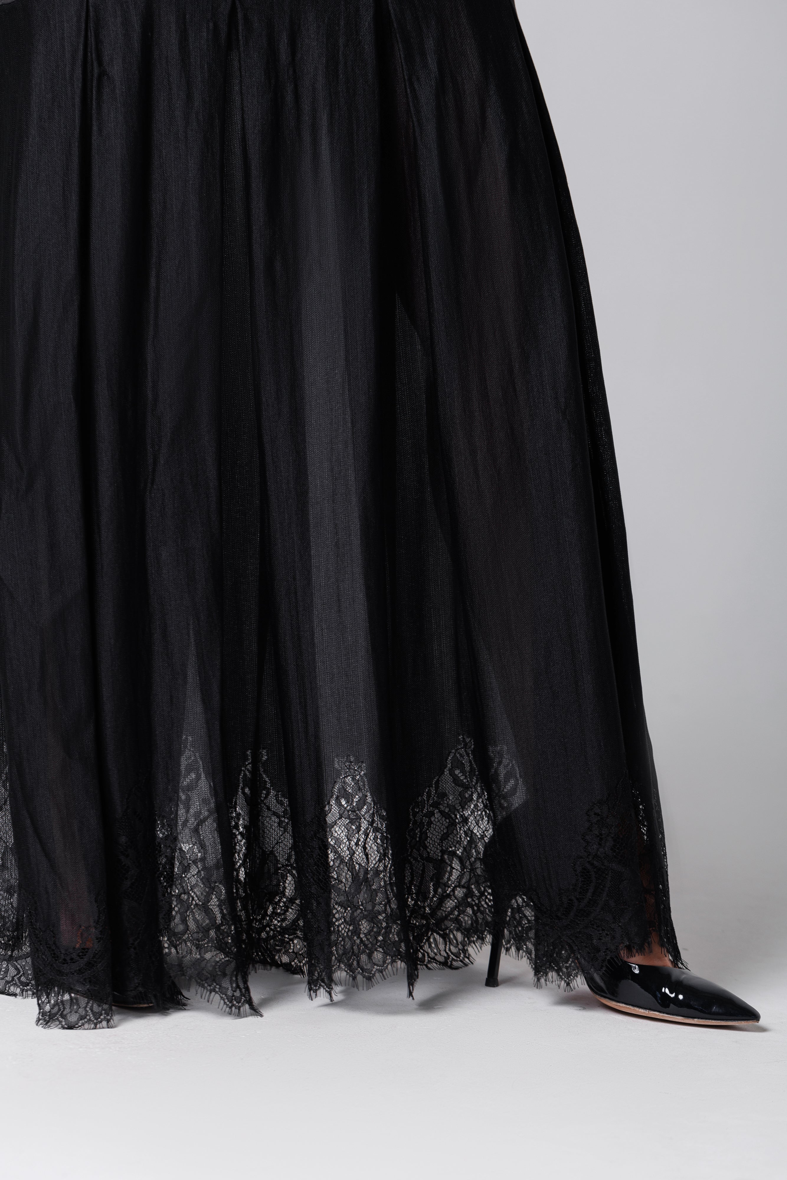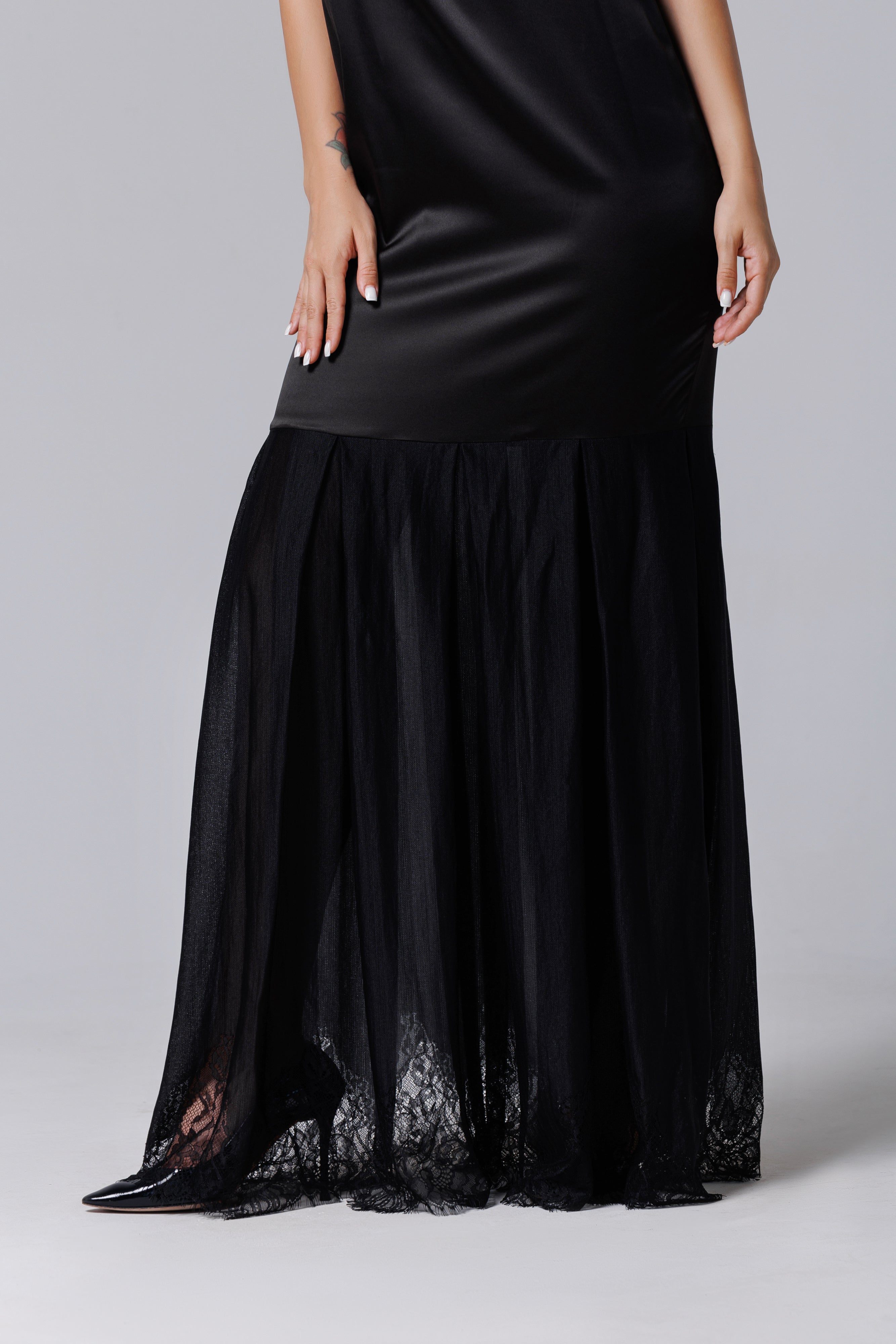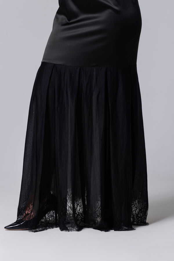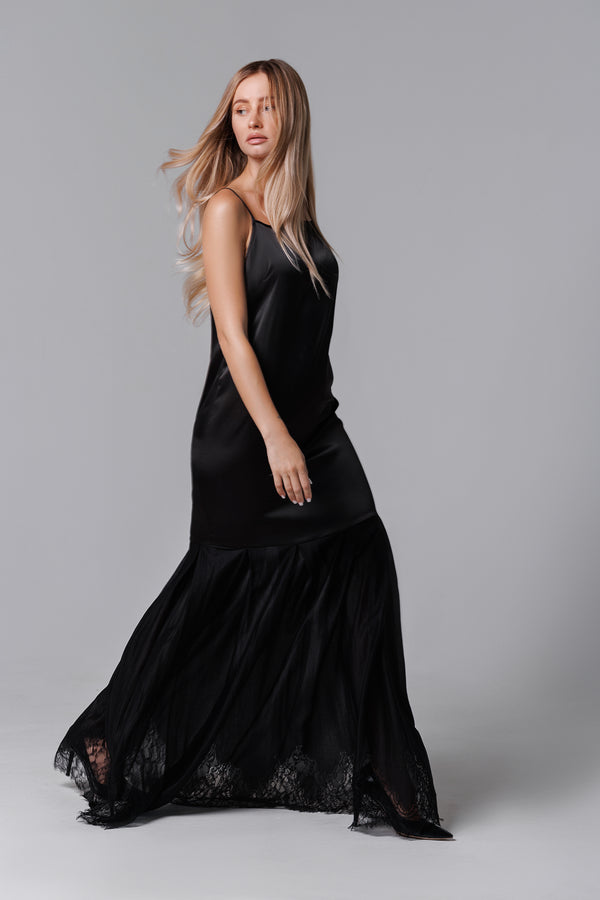 Rochie lungă neagră din satin și dantelă franțuzească