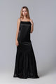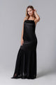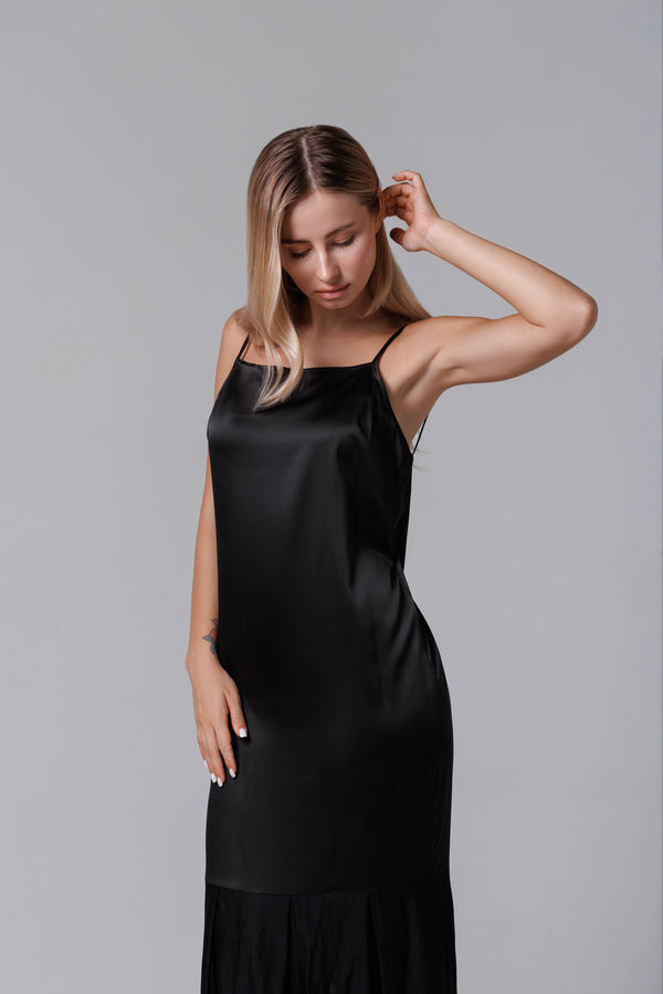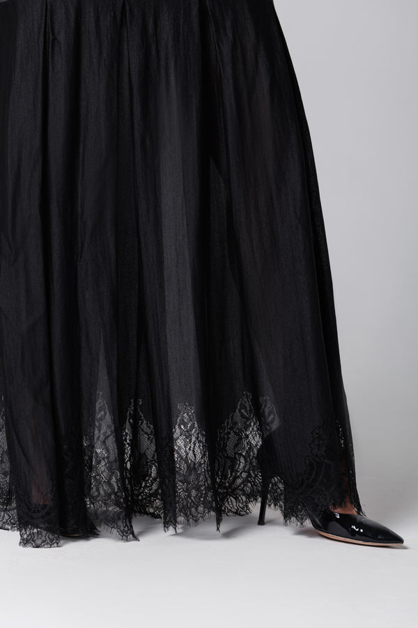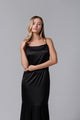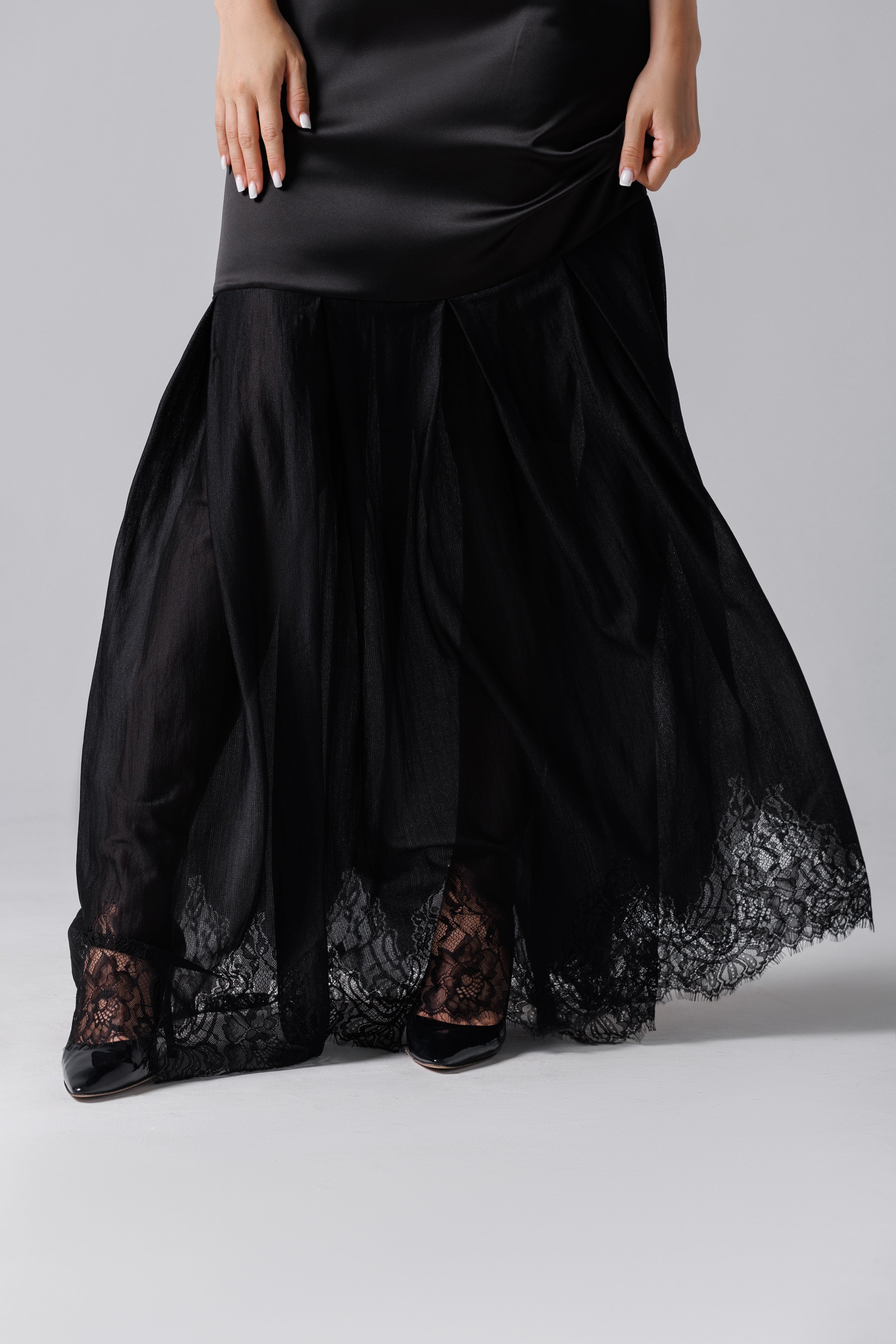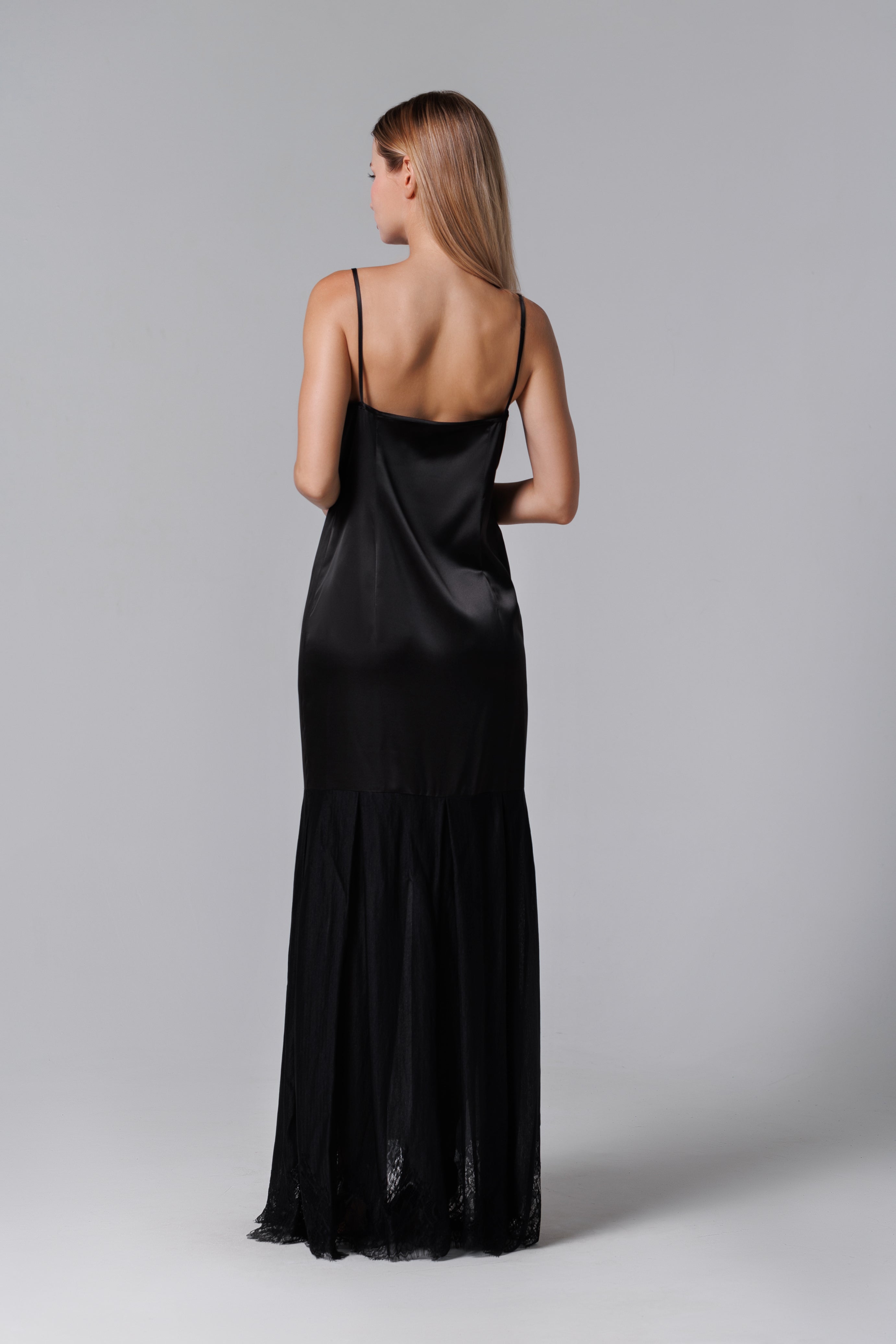Rochie lungă neagră din satin și dantelă franțuzească