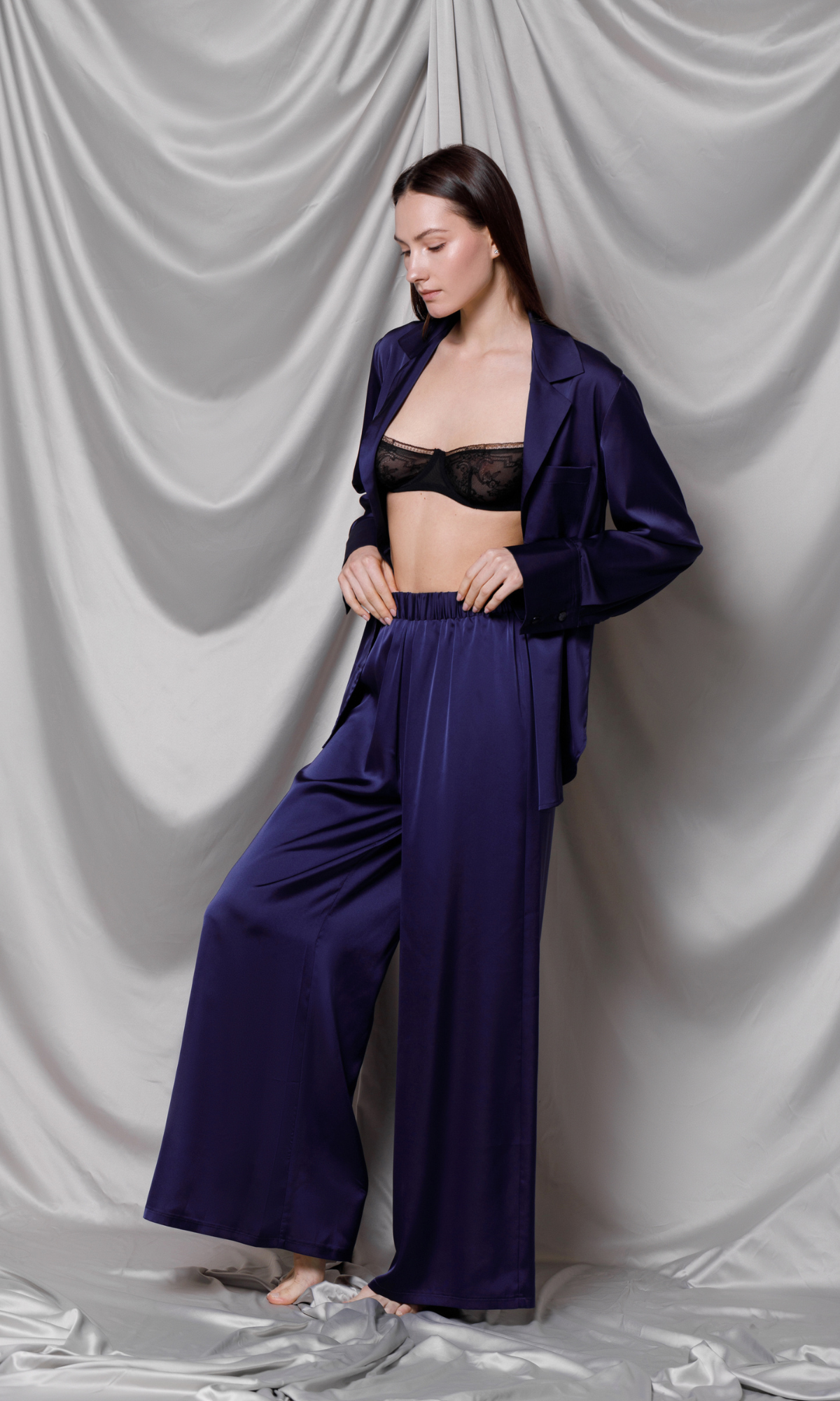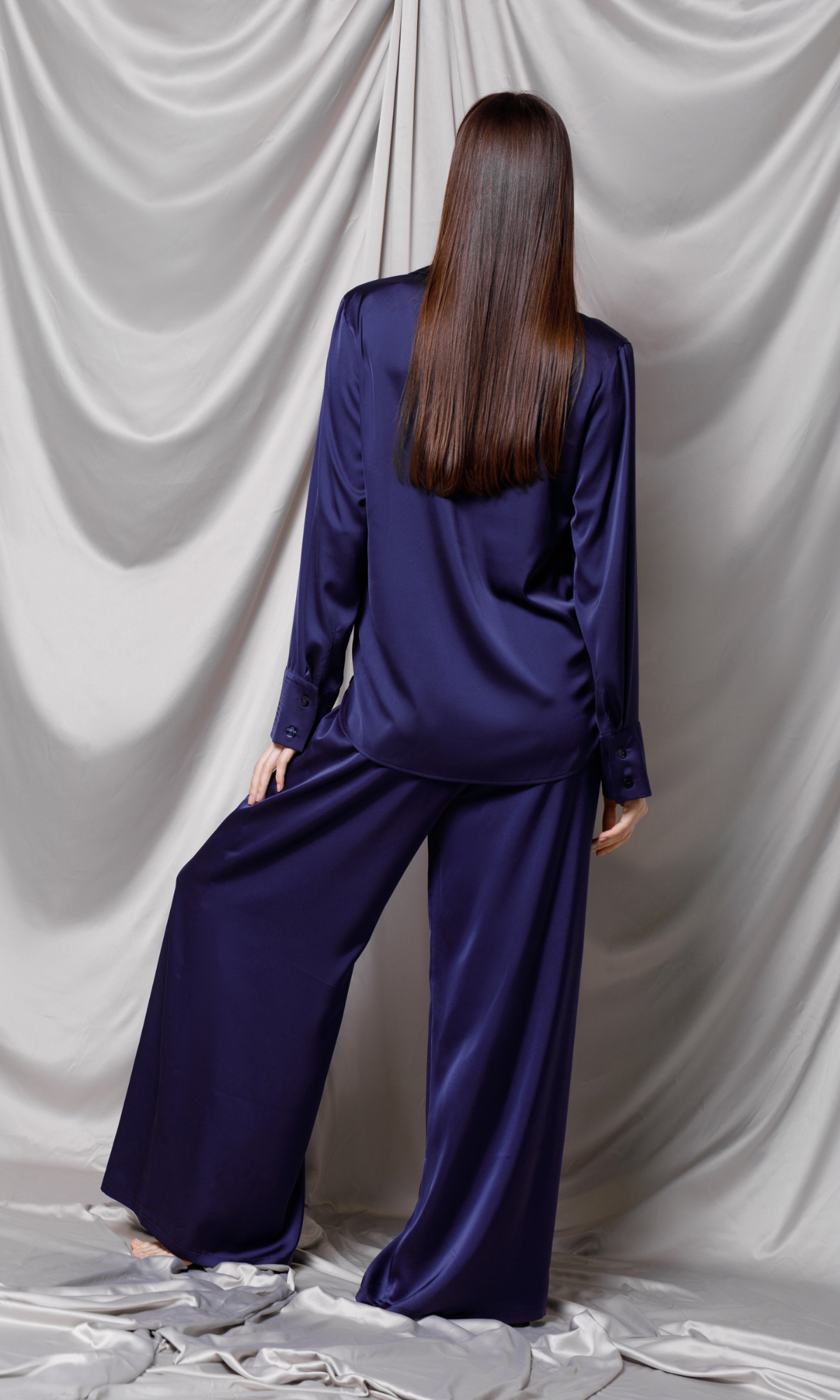 Pantalonii palazzo, de o eleganță rafinată, sunt confecționați din satin de înaltă calitate într-o nuanță intensă de albastru marin. Designul lor larg oferă o siluetă modernă și sofisticată. Talia înaltă, elastică, asigură atât confort cât și o potrivire fără efort, ideală pentru a fi purtată pe parcursul întregii zile sau pentru evenimente speciale. Mătasea fluidă cade frumos pe picioare, creând o mișcare grațioasă și un aspect luxuriant. Acești pantaloni pot fi purtați ca parte a unui set coordonat cu un top din mătase sau ca punct focal al unei ținute cu o bluză simplă, adăugând o notă de opulență oricărui look.