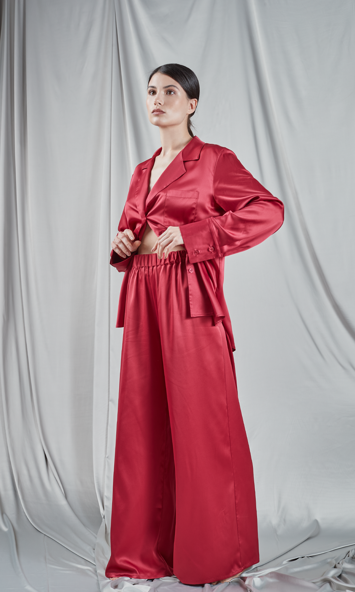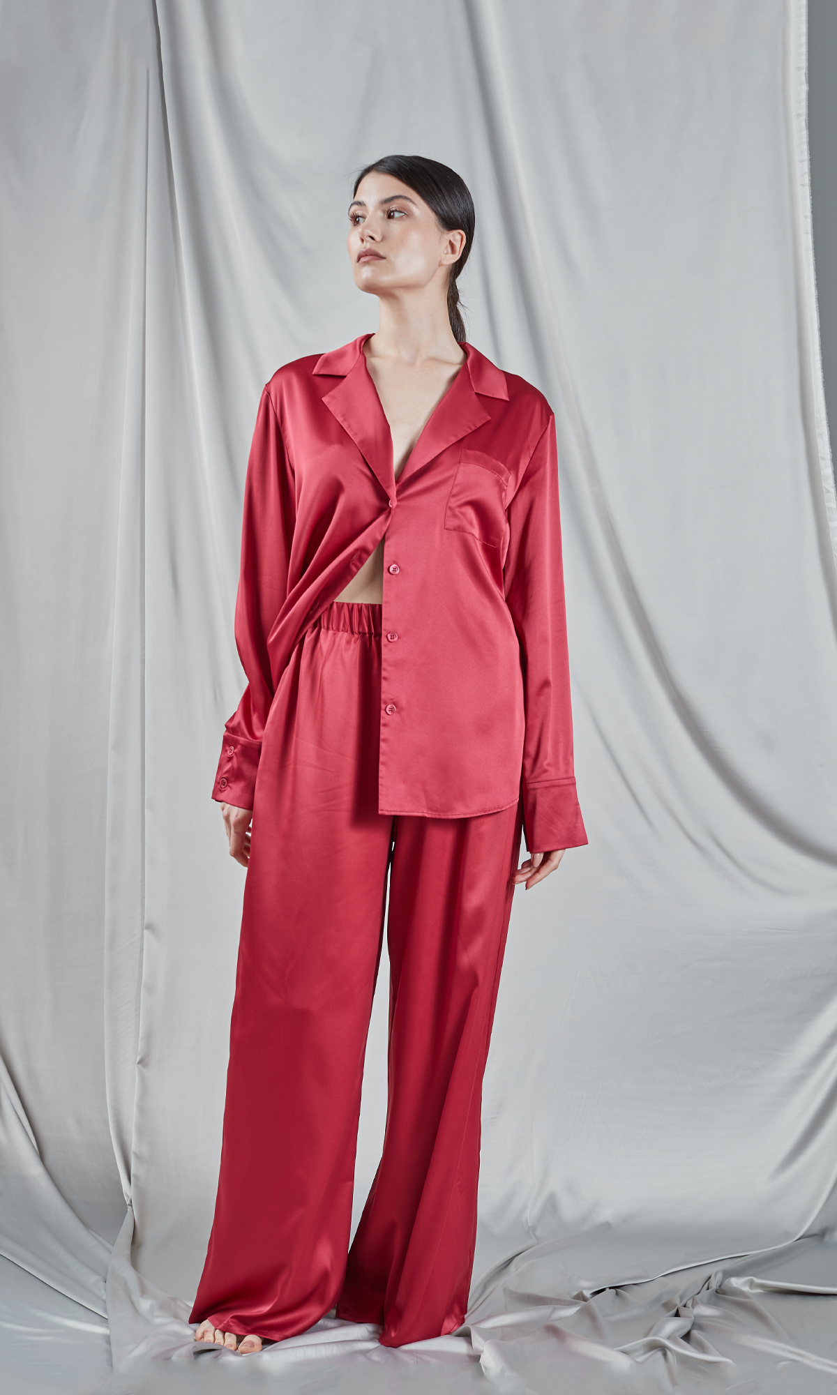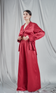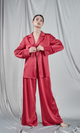 Set elegant format dintr-un top tip cămașă și pantaloni palazzo, ambele piese fiind realizate dintr-o stofa de culoare roșie burgund. Cămașa are un guler clasic, mâneci lungi și se închide în față cu nasturi, care adaugă o notă clasică și rafinată ansamblului. Pantalonii au o talie înaltă, elastică, ce oferă confort și o formă relaxată, iar croiul larg al pantalonilor completează aspectul sofisticat și modern al setului. Această combinație este ideală pentru momente de relaxare acasă, menținând un aer de lux și confort. Materialul lucios al mătăsii subliniază senzația de rafinament și confort în care te poți învălui.