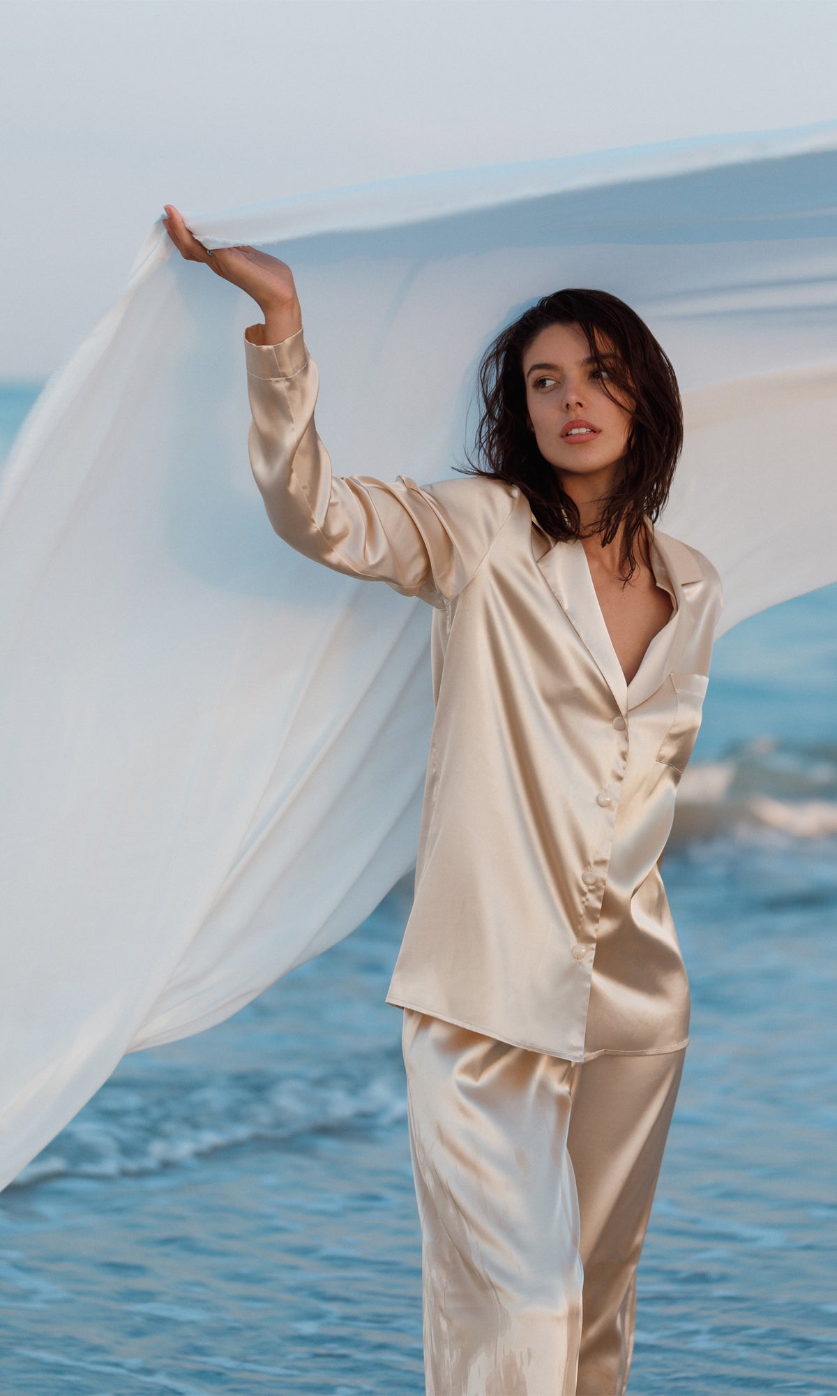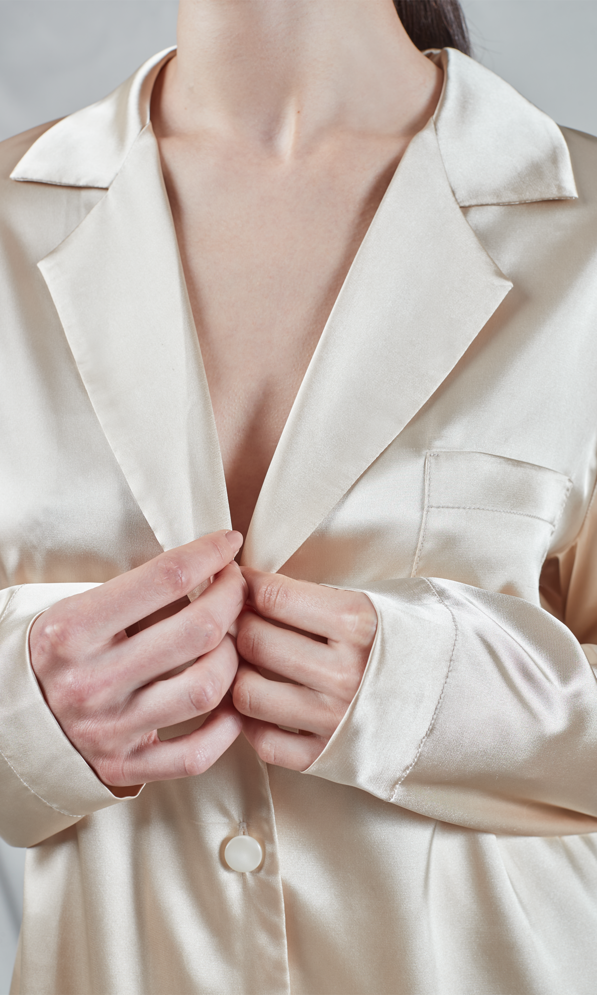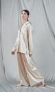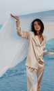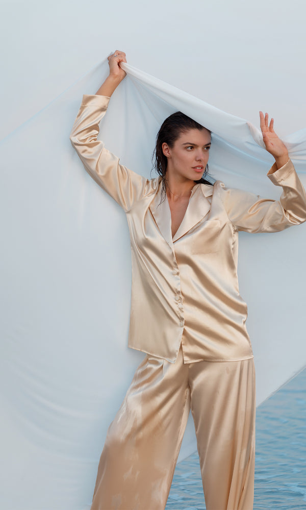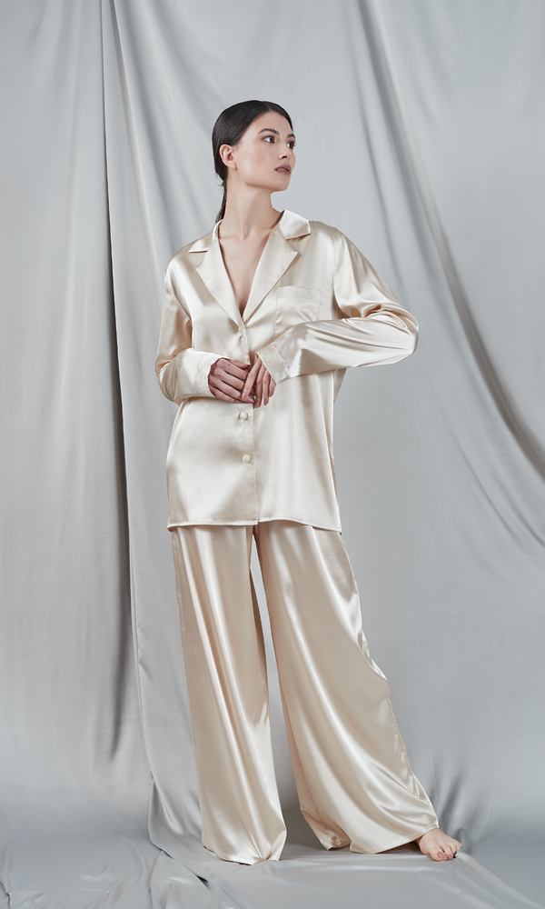 Set de pijamale de lux format dintr-o cămașă și pantaloni palazzo, realizat din satin de culoare champagne. Cămașa are un guler clasic, mâneci lungi și se închide în față cu nasturi, oferind un aspect atât sofisticat, cât și confortabil. Pantalonii sunt largi, cu o talie înaltă care completează silueta, asigurând un confort deplin și o mișcare fluidă. Nuanța deschisă de champagne a materialului de mătase subliniază eleganța și rafinamentul întregului set, fiind ideal pentru relaxare sau ca o ținută confortabilă pentru acasă. Finisajul lucios al materialului adaugă o notă de lux și distincție.