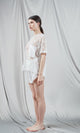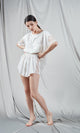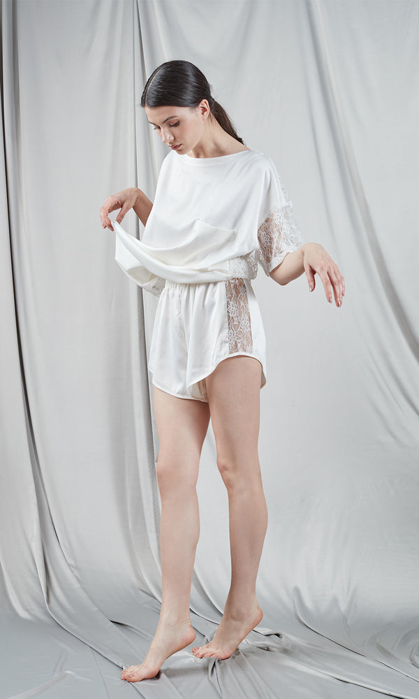 Pantaloni scurți confecționați din satin ivory, având o talie elastică pentru confort și o potrivire flexibilă. Designul minimalist și luxos al acestor pantaloni scurți îi face versatili, potriviți atât pentru relaxare acasă, cât și pentru a fi purtați ca parte a unui set elegant de pijamale. Detaliile de dantelă adaugă un accent delicat, subliniind calitatea înaltă și estetica sofisticată a designului.