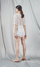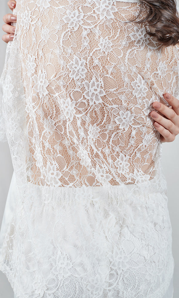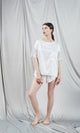Tricoul cu model casual-elegant și culoare ivory. Designul modern include un guler rotund larg și mâneci scurte, detaliate cu inserții de dantelă florală care adaugă o notă de finețe. Tricoul are o croială largă și relaxată, cu tivul rotunjit, ce oferă o cădere fluidă și confortabilă. Este confecționat din mătase dând o notă de lux și confort. Această piesă versatilă este perfectă în garderoba de zi cu zi sau ca parte a unui ansamblu de lounge sau pijama.