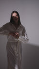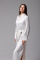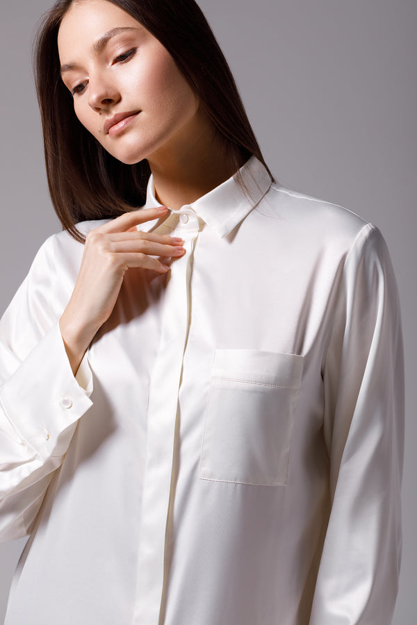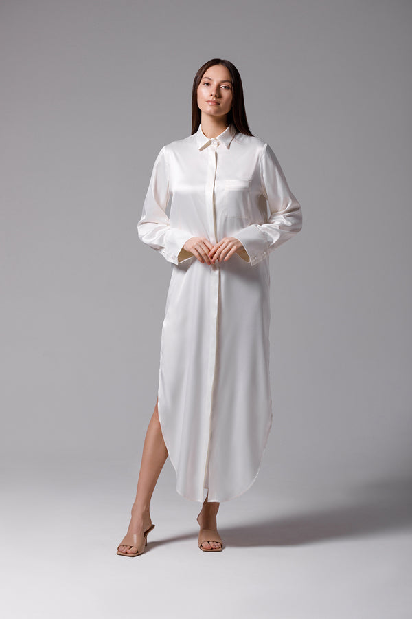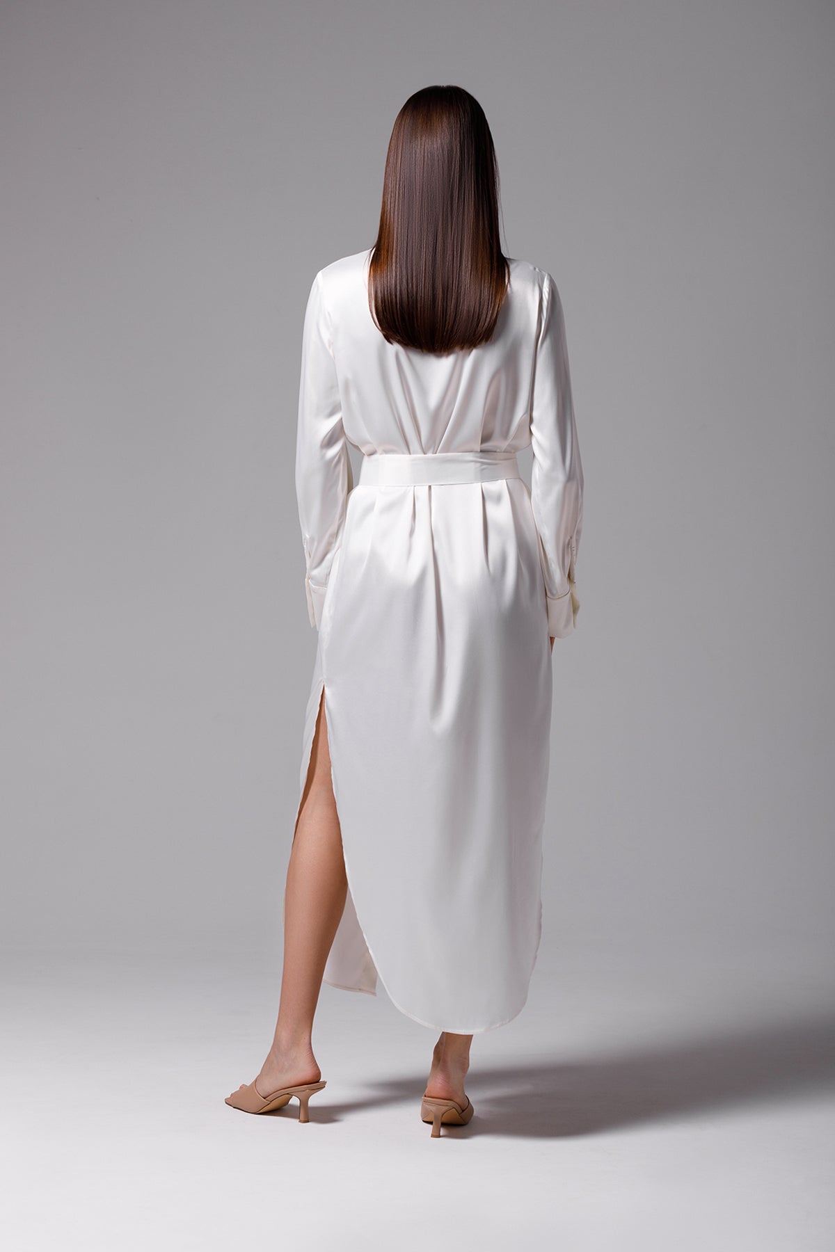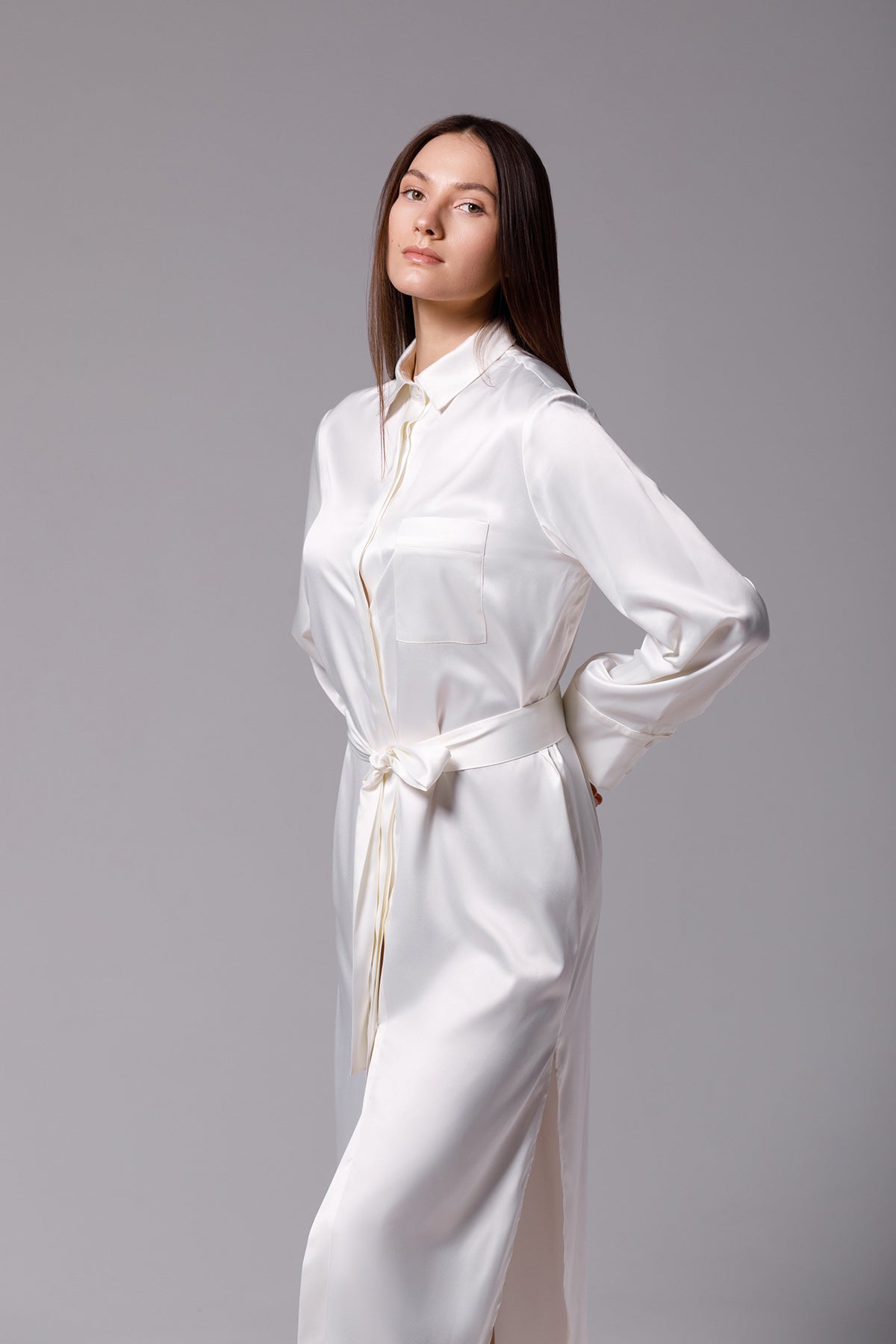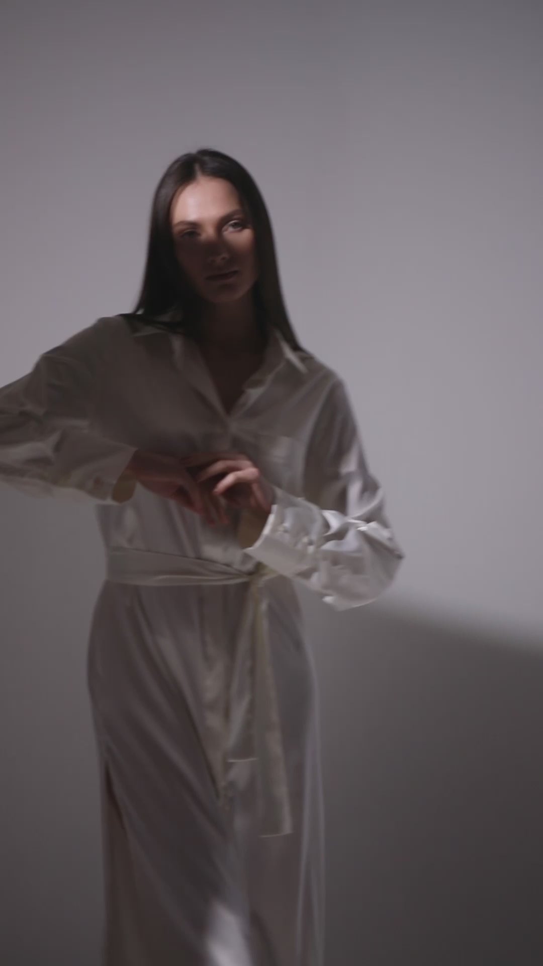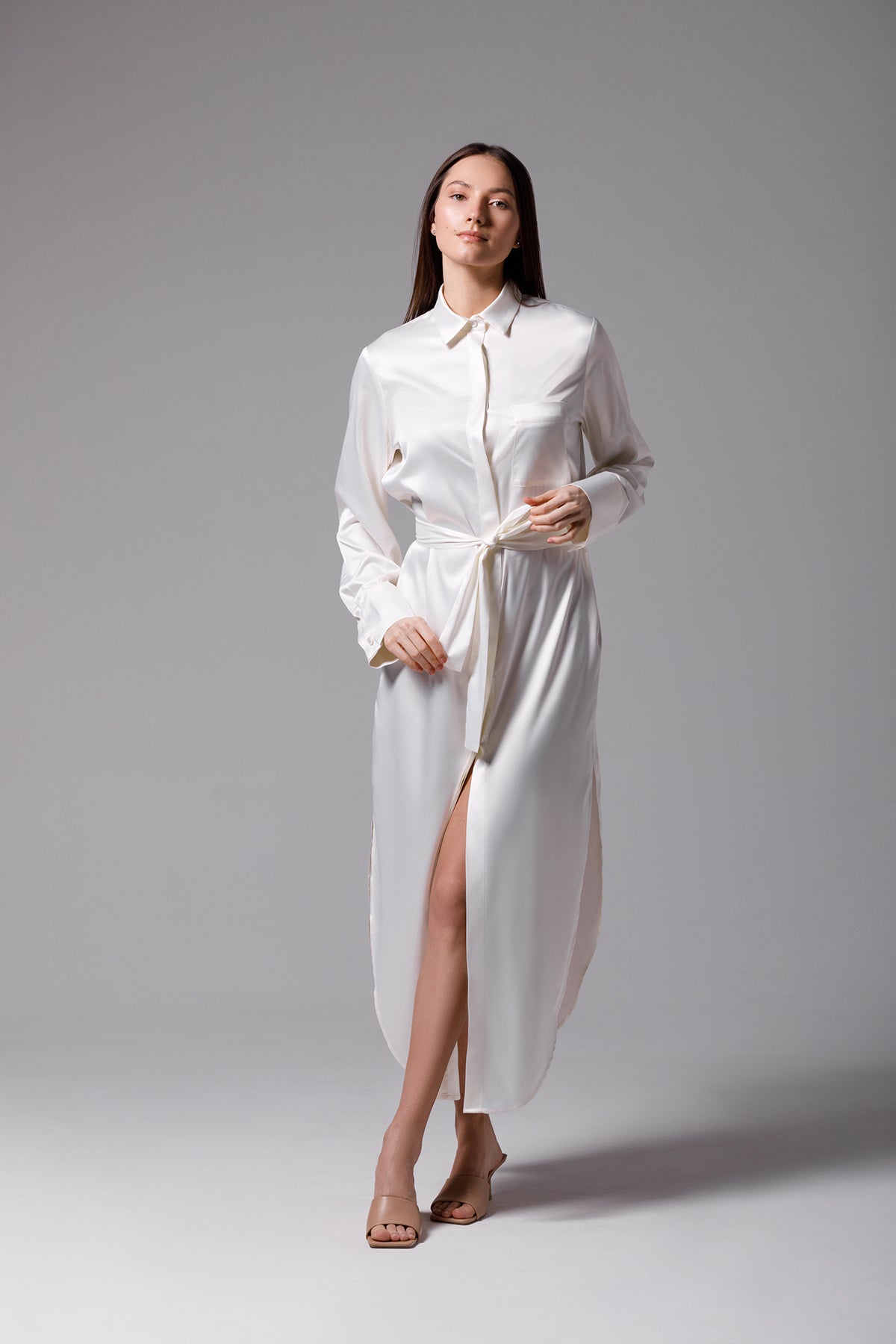 Rochie lungă în stil cămașă, de culoare ivory, emană rafinament și confort. Realizată dintr-un material extrem de moale, este perfectă pentru a fi purtată atât în timpul somnului, cât și în timpul zilei, oferind un plus de lux și eleganță. Are o croială care se întinde până jos și o siluetă relaxată, conferindu-ți libertate de mișcare și confort. Detaliile cu închideri cu nasturi și marginea curbată adaugă un plus de stil și rafinament. Poți evidenția talia cu ajutorul curelei asortate, pentru un aspect elegant și feminin.