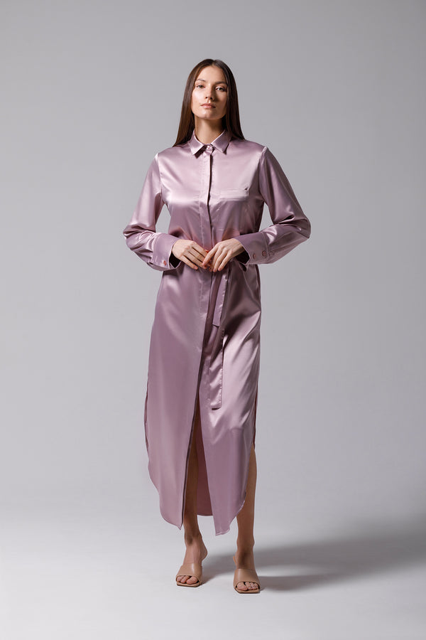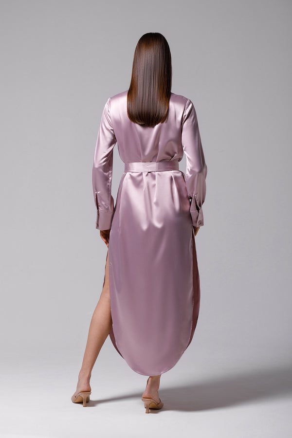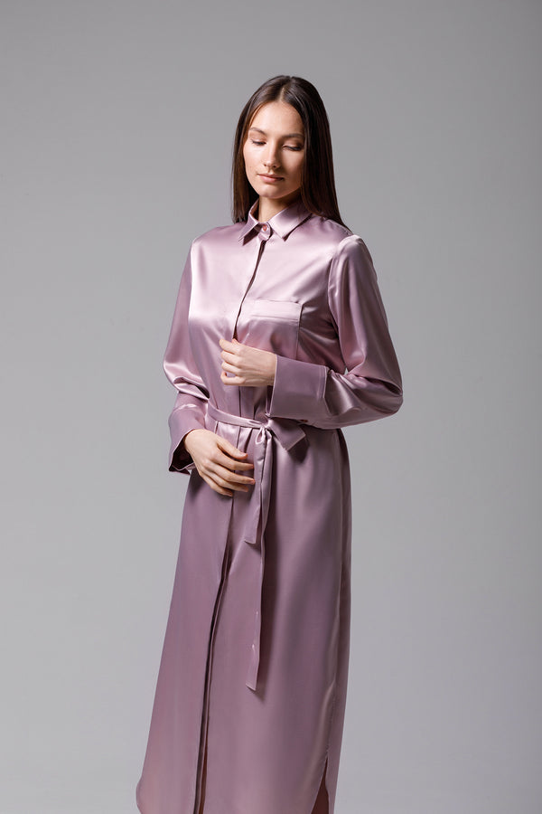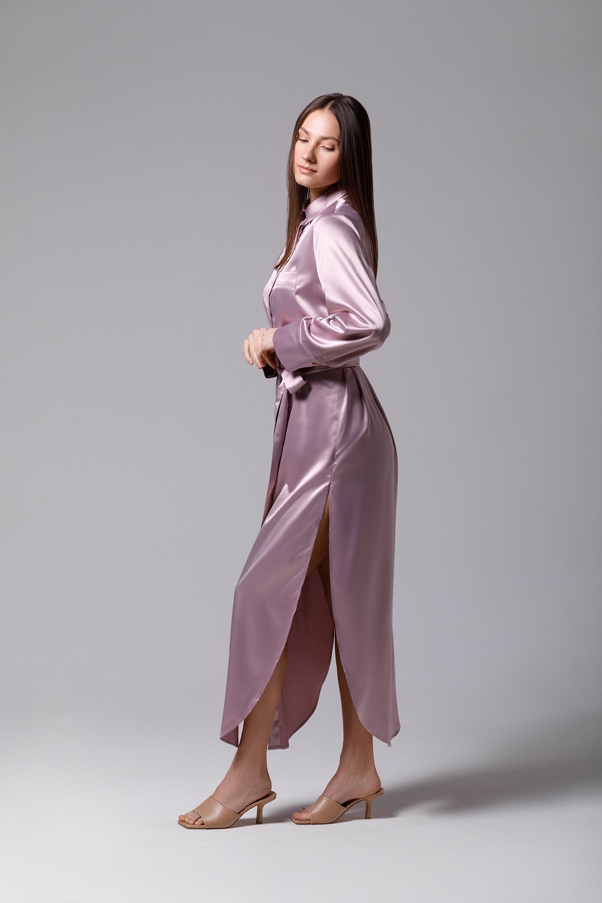 Rochia maxi tip cămașă, de culoare roz, este pur și simplu irezistibilă. Fabricată dintr-un material extrem de moale de satin , această piesă este perfectă pentru a te relaxa în timpul somnului, dar și pentru a te bucura de lux în timpul zilei. Are o croială lungă și o siluetă lejeră, oferind confortul necesar în orice moment al zilei. În plus, este detaliată cu închideri cu nasturi în față și are o margine curbată, iar pentru un plus de stil, este accesorizată cu o curea asortată, care îți evidențiază frumos talia.