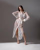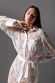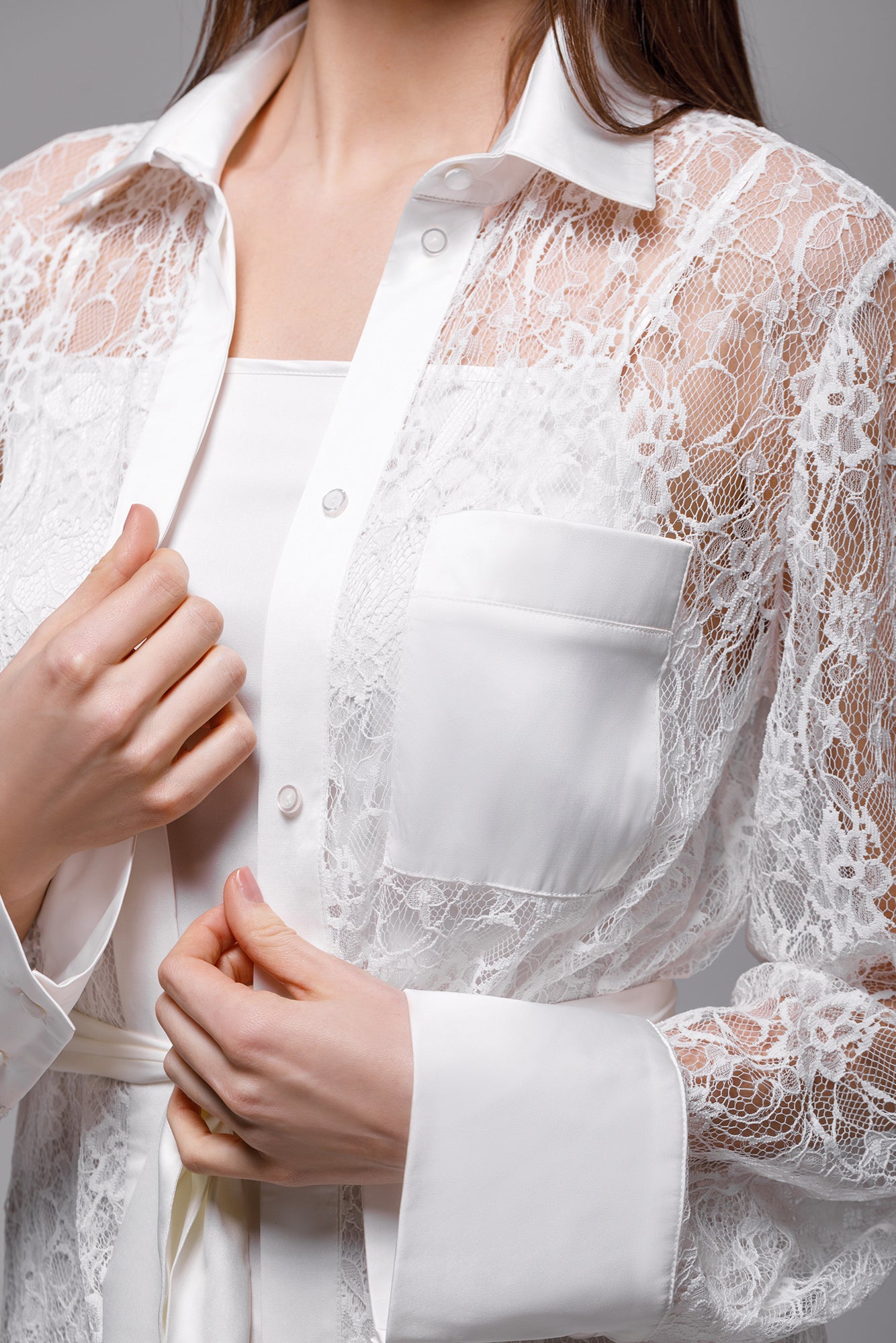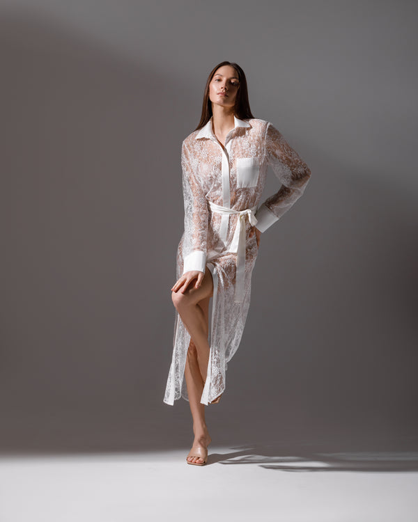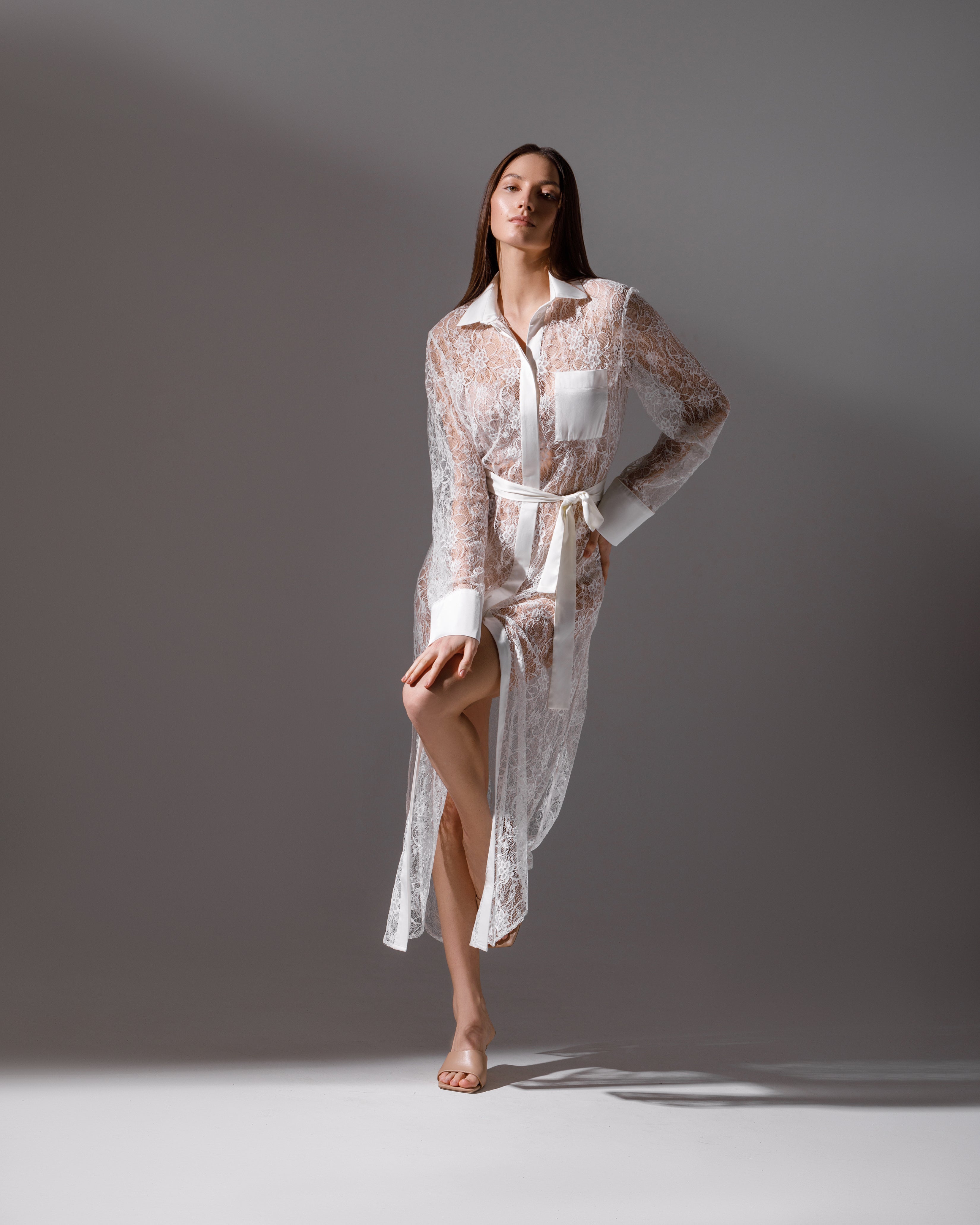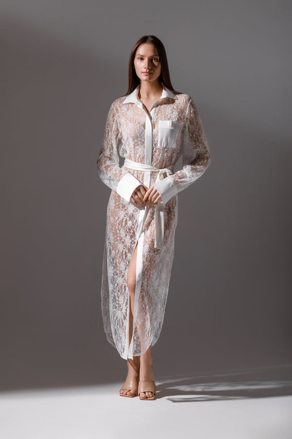 Descoperă eleganța și rafinamentul într-o rochie  deosebită tip cămașă, realizată din dantelă albă de înaltă calitate, cu finisaje delicate din satin. Această rochie îmbină farmecul clasic al dantelei cu luxul subtil al satinului pentru a crea o piesă vestimentară cu adevărat remarcabilă.