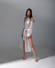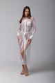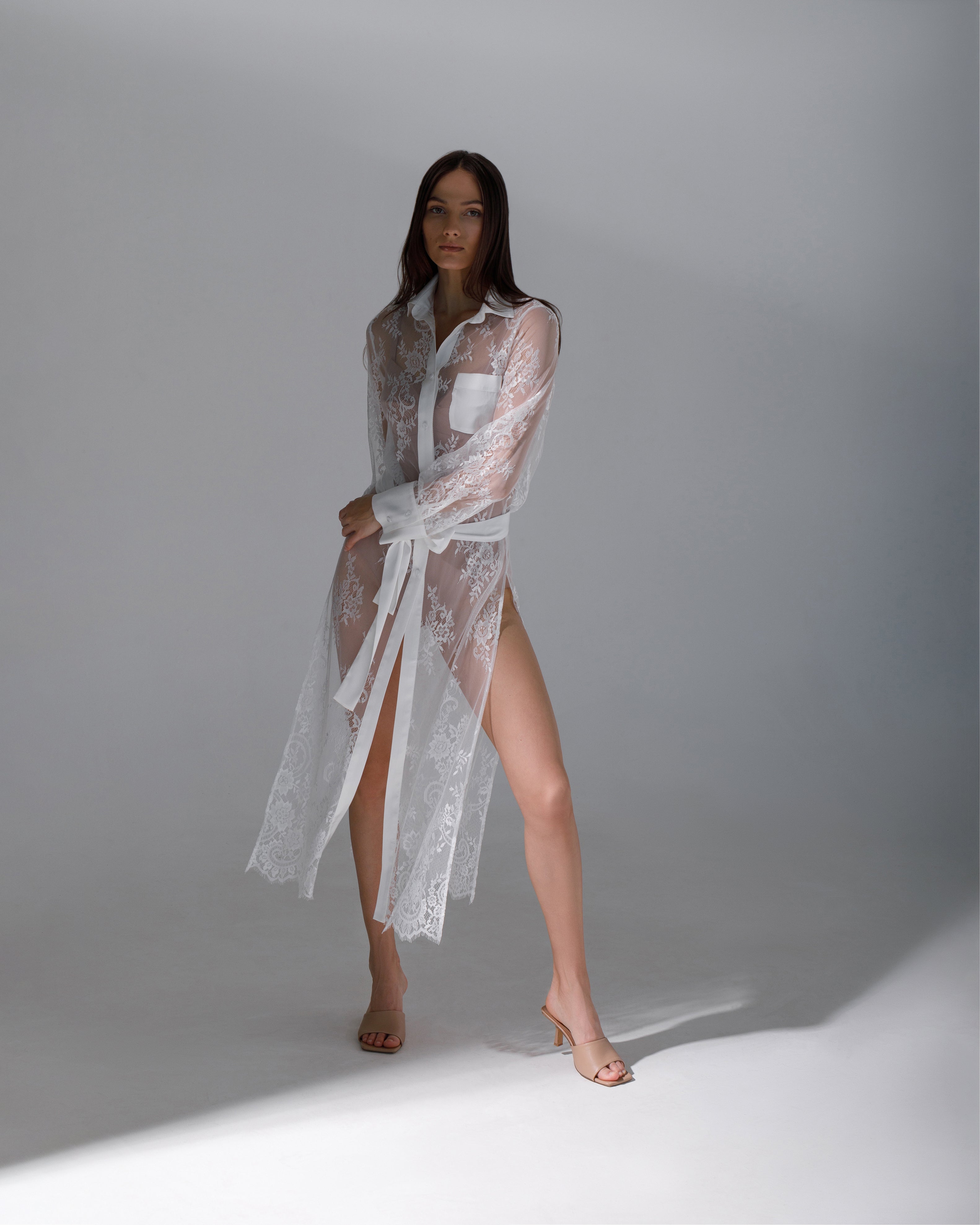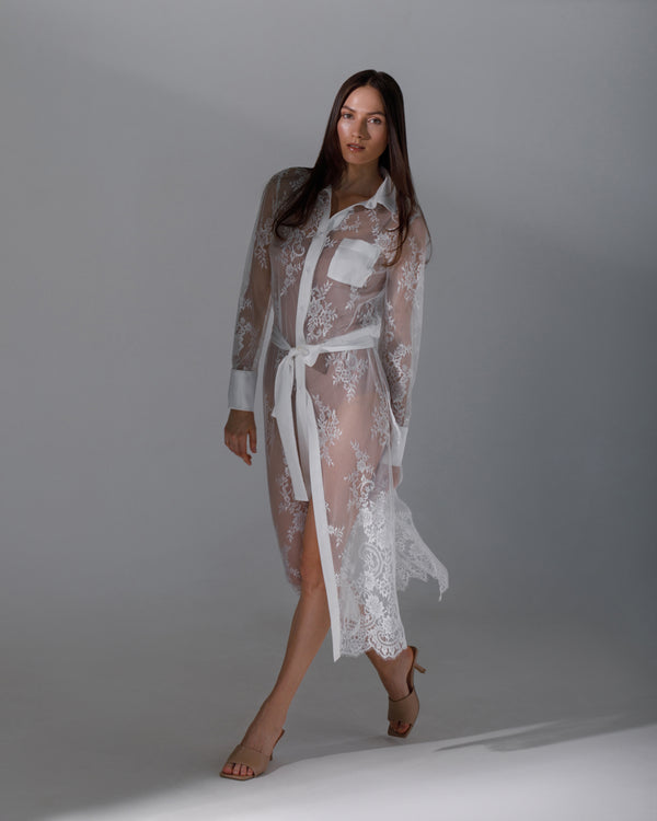 Descoperă eleganța și rafinamentul într-o rochie  deosebită tip cămașă, realizată din dantelă albă de înaltă calitate, cu finisaje delicate din satin. Această rochie îmbină farmecul clasic al dantelei cu luxul subtil al satinului pentru a crea o piesă vestimentară cu adevărat remarcabilă.