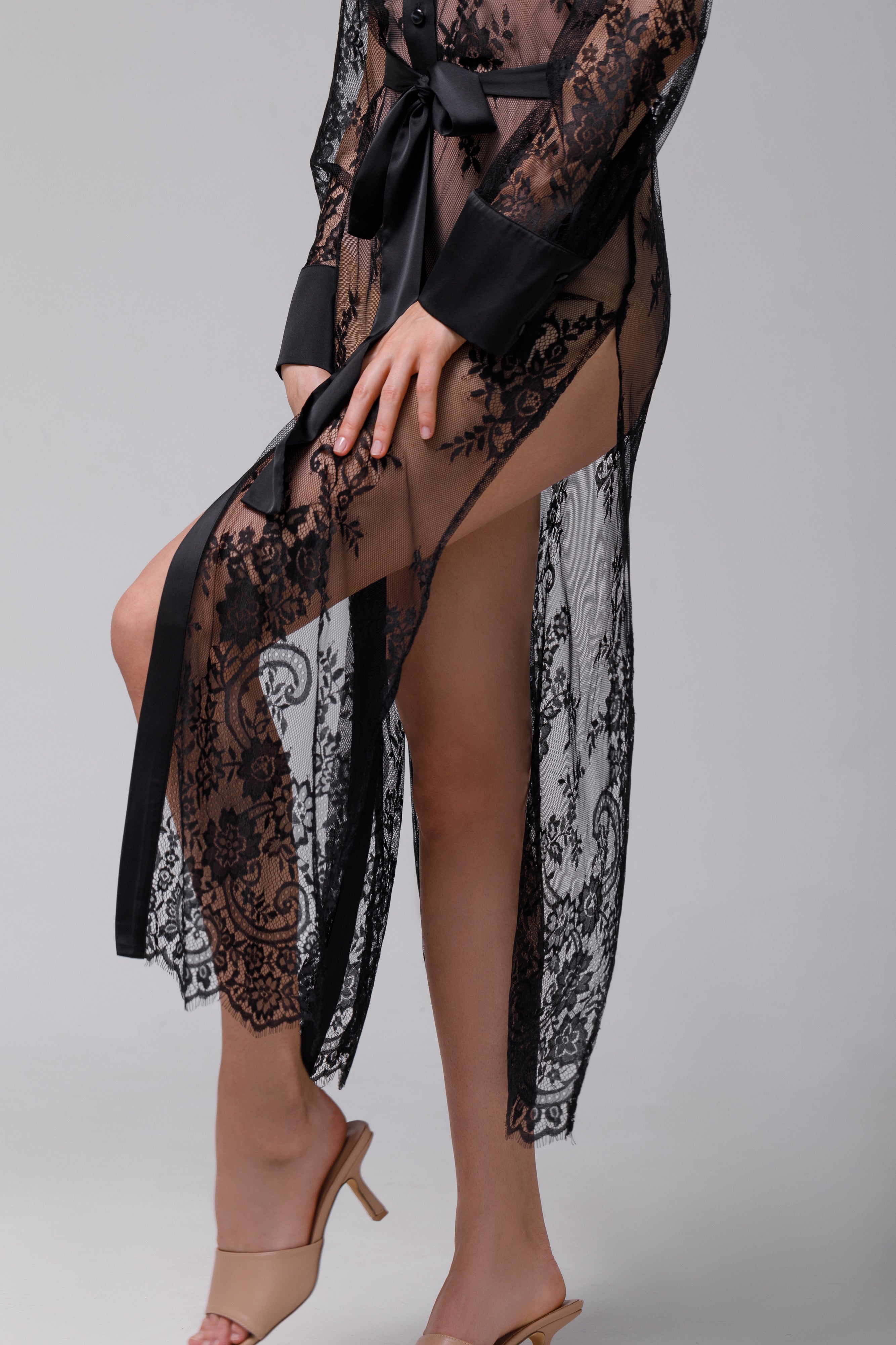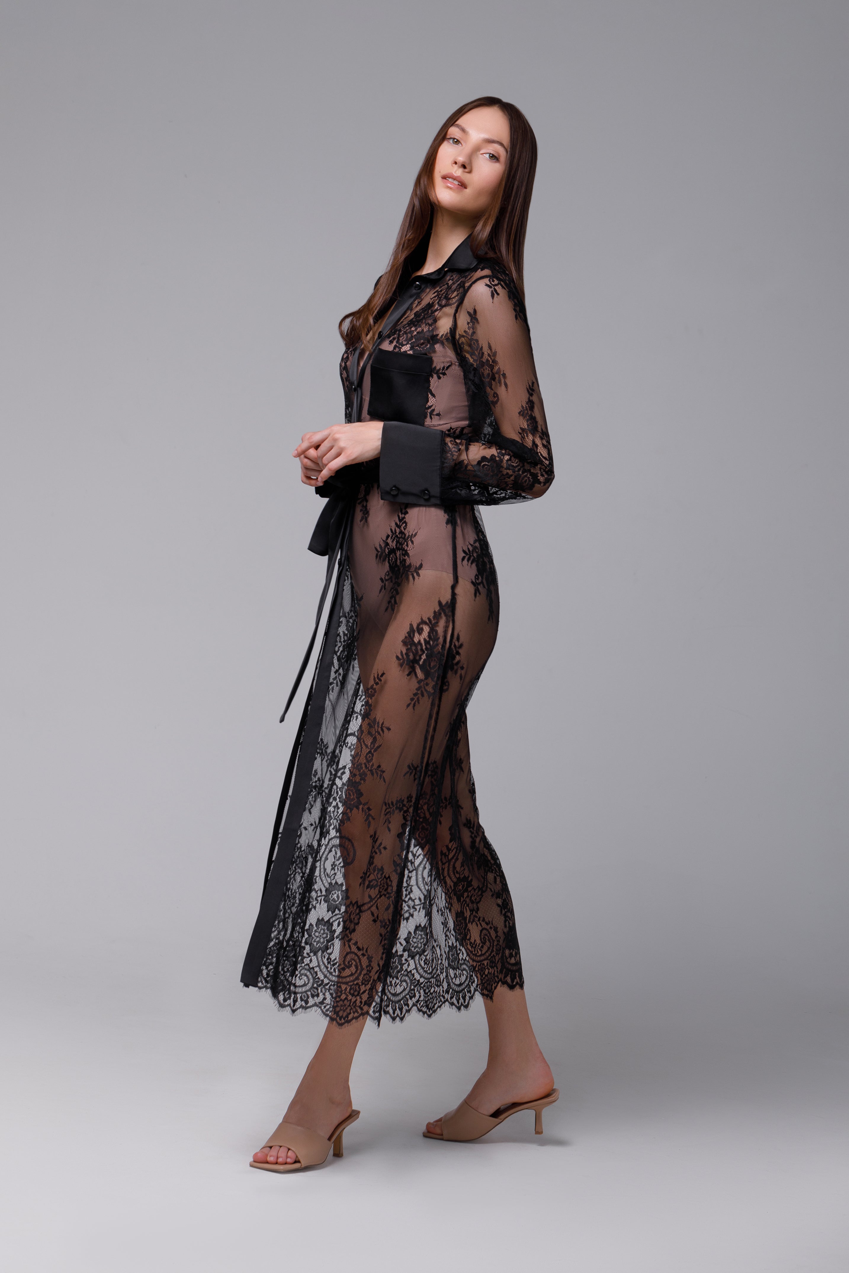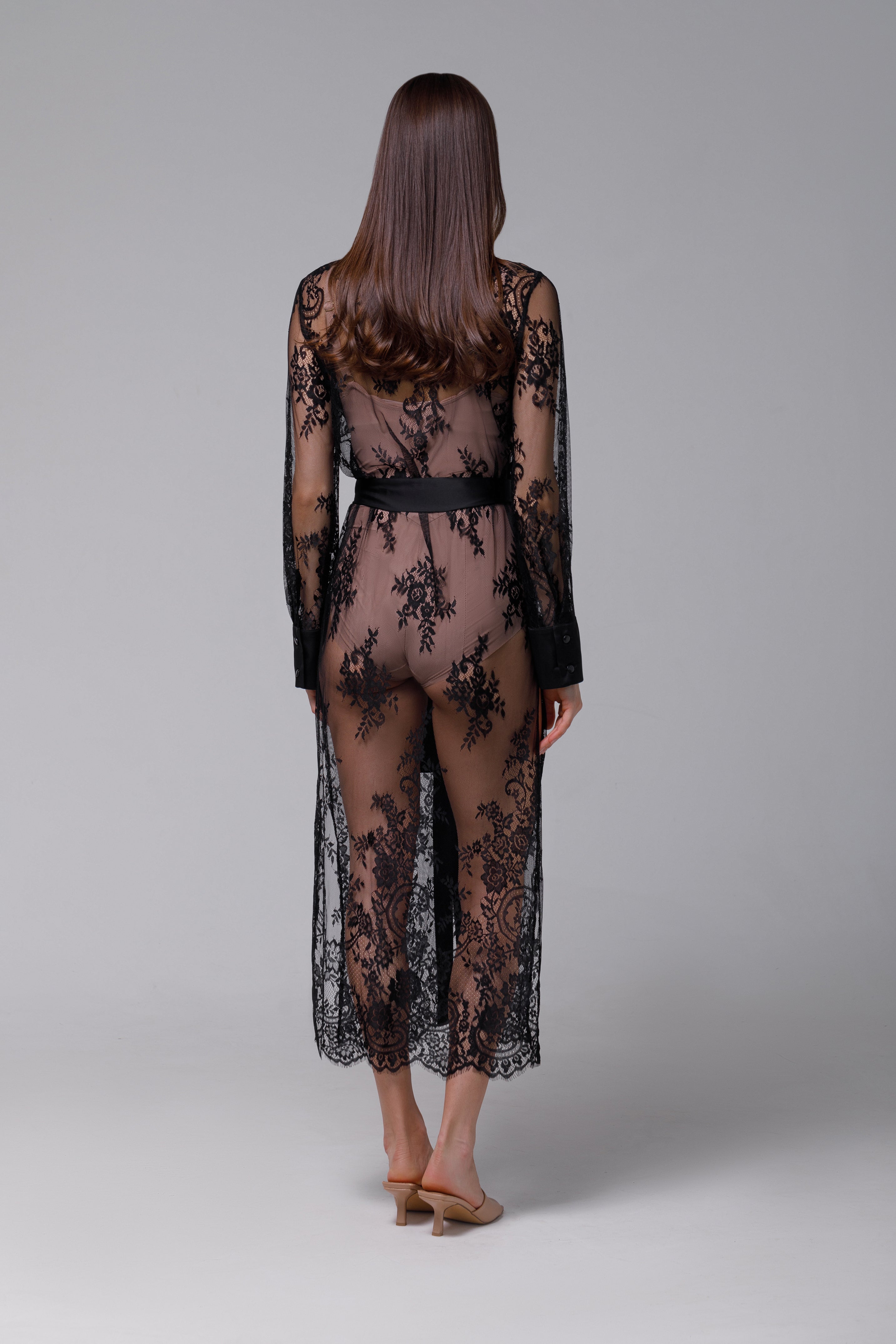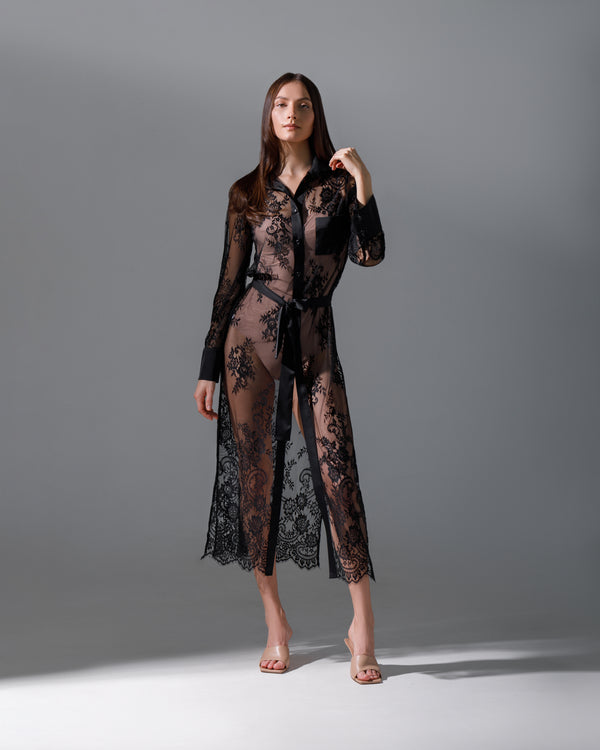 Descoperă eleganța și rafinamentul într-o rochie  deosebită tip cămașă, realizată din dantelă neagră de înaltă calitate, cu finisaje delicate din satin. Această rochie îmbină farmecul clasic al dantelei cu luxul subtil al satinului pentru a crea o piesă vestimentară cu adevărat remarcabilă.