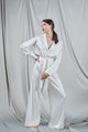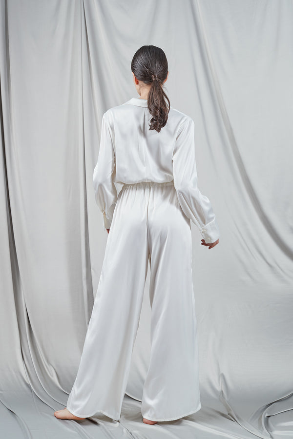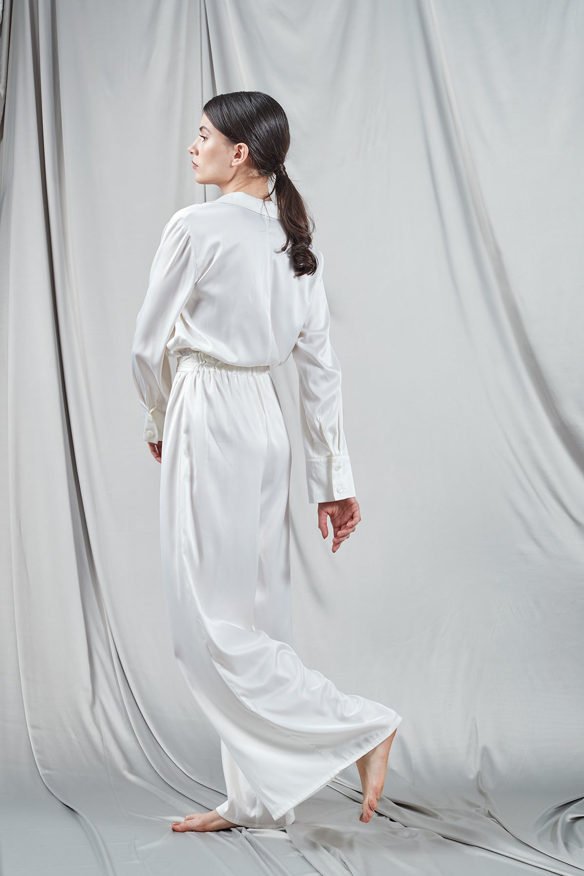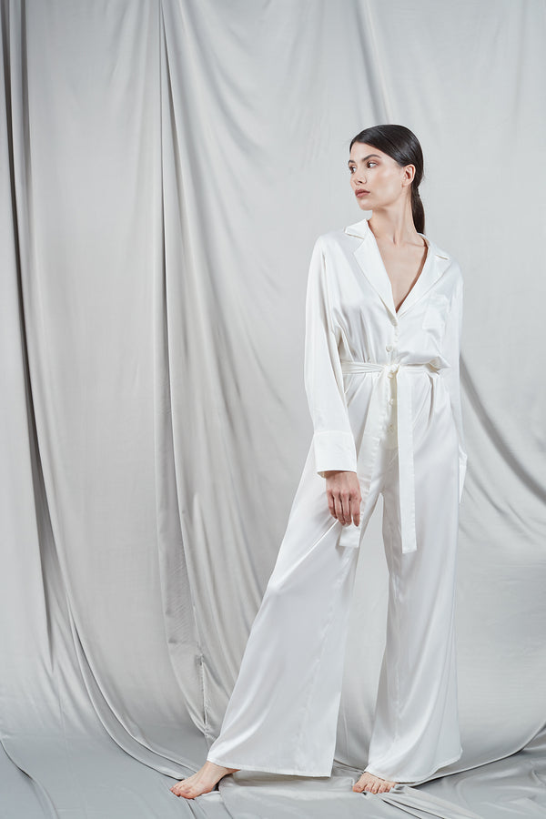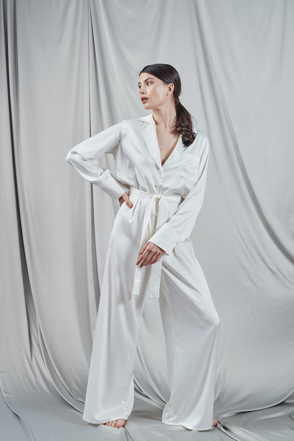 Salopetă versatilă, o piesă vestimentară sofisticată ivory. Prezintă un design cu mâneci lungi și un decolteu în V, care adaugă o notă de feminitate și rafinament. Este închisă în partea din față cu nasturi ton-sur-ton, care se estompează elegant în material. Talia este evidențiată printr-o centură în același material și culoare, legată, ce ajută la conturarea siluetei. Pantalonii sunt de tip palazzo, largi, ce oferă ținutei un aspect contemporan și o alură relaxată. Fabricată din mătase cu o cădere fluidă, această salopetă ivory este o alegere stilată, ideală pentru evenimente formale sau pentru o ținută smart-casual.