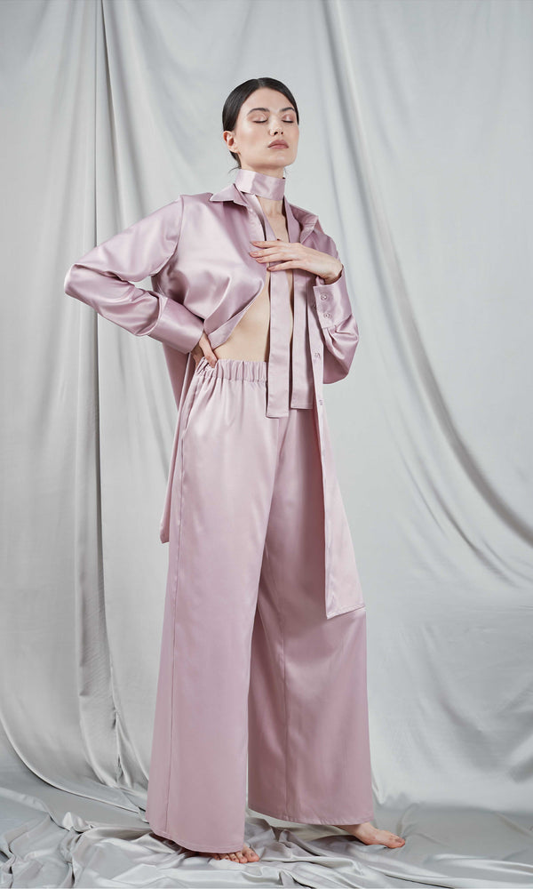Pantaloni Palazzo din satin roz pal