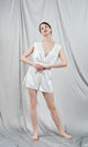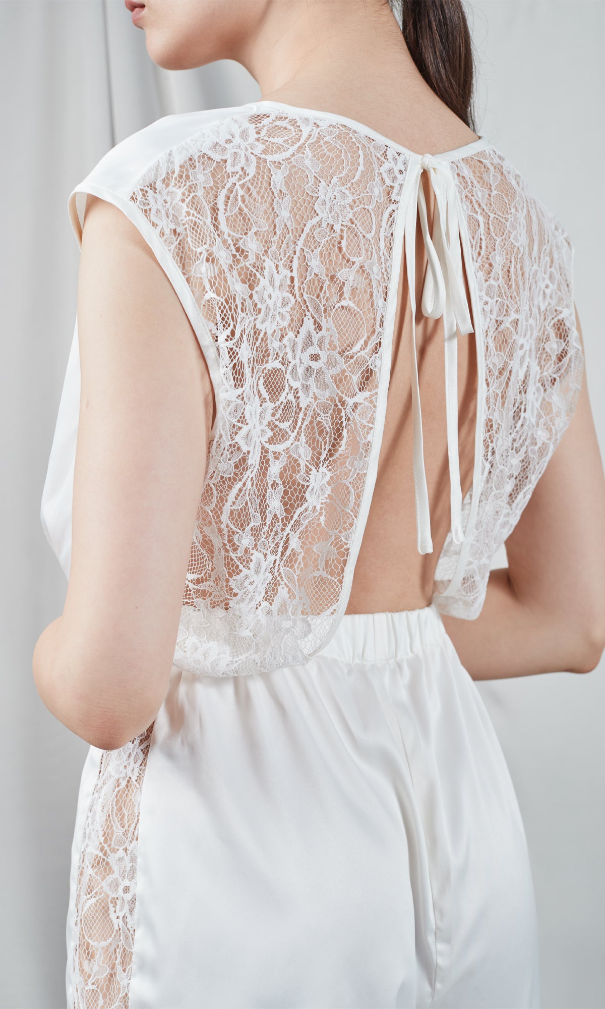 Salopetă feminină și sofisticată, confectionată din satin de culoare ivory. Partea de sus are un decolteu în V generos, care adaugă un aer seducător piesei, iar spatele este decorat cu o inserție de dantelă ivory fină, completată de o legătură delicată ce permite ajustarea. Talia elastică a salopetei scoate în evidență silueta, iar pantalonii scurți conferă un aspect jucăus și confortabil. Combinația de mătase și dantelă sugerează un echilibru între eleganță și senzualitate, făcând această piesă perfectă pentru o varietate de ocazii, de la o seară relaxantă acasă până la o ieșire casual.