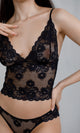 Descoperă topul nostru negru din dantelă, încrustat cu trandafiri sublimi. Realizat din dantelă elastică extraordinar de moale, acest top reprezintă o alegere elegantă și rafinată. Cu o margine festonată și un tiv cochet în formă de V, acesta adaugă un plus de subtilitate și farmec fiecărei ținute. Bretelele sunt reglabile pentru a se potrivi perfect contururilor tale, iar topul este necăptușit pentru un confort sporit.